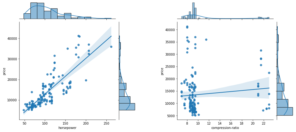 <์ ์ ํ๋ ํน์ฑ ์ค horsepower, ๊ทธ๋ฆฌ๊ณ ์ ํ ์๋ ํน์ฑ ์ค compression-ratio๋ฅผ ๊ฐ๊ฐ jointplot์ผ๋ก ์๊ฐํํ ๊ฒฐ๊ณผ>