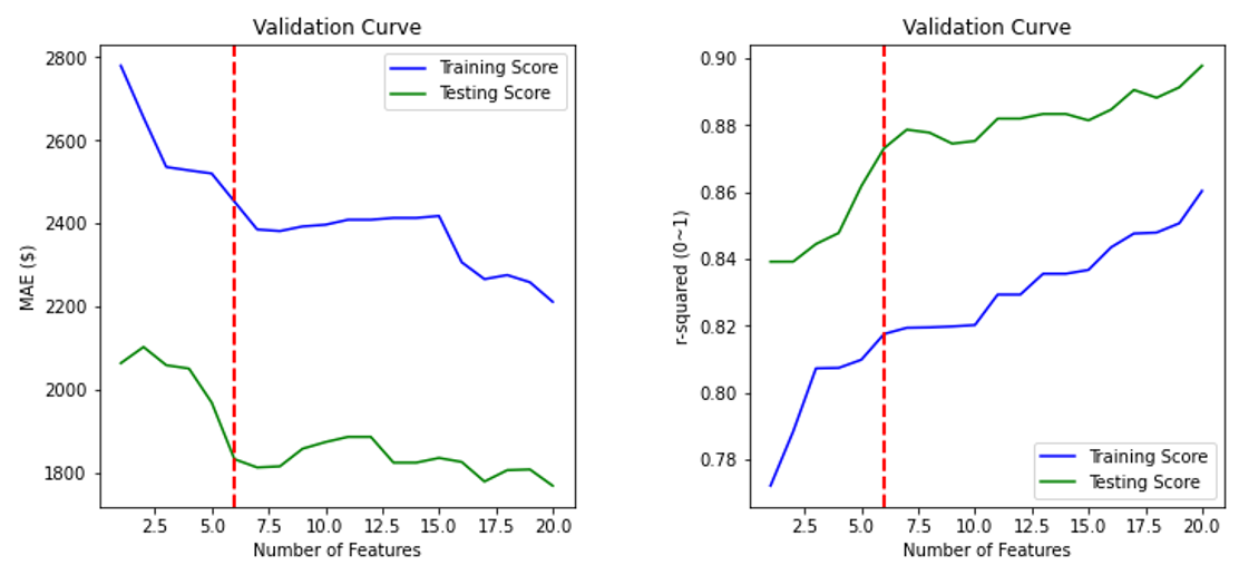 ๐งธ validation curve ์๊ฐํ ๊ฒฐ๊ณผ(MAE)๋ฅผ ๋ณด์์ ๋ feature ๊ฐ์๊ฐ ๋์ด๋ ์๋ก ์ด์ ๊ณผ์ ํฉ๋์ด error๊ฐ ๊ฒฐ๊ตญ์ ์ญ ๊ฐ์ํ๋ ๊ฒ์ ๋ณผ ์ ์๋ค. ํ์ง๋ง overfitting์ ๋ฌธ์ & ๋ชจ๋ธ training time์ ๊ฐ์ ํจ์จ์ฑ์ ์ํด features ์๊ฐ ์ ๊ฒ ์ ํ๋๋ ๊ฒ ์ข๊ธฐ ๋๋ฌธ์ error๊ฐ ํฐ ํญ์ผ๋ก ๊ฐ์ํ๋ ์์ ์ธ, features ์๊ฐ 6๊ฐ์ผ ๋๊ฐ ์ต์ ์ feature selection (selectKBest()๋ก๋ง ๋ณด์์ ๋)๋ผ๊ณ ํ๋จํ ์ ์๋ค. ์ฌ๊ธฐ์ test set error๊ฐ ์ ์ผ ์ ์ 20์ด ์ ์ผ ์ข์ ๊ฒ์ด ์๋๊ฐ ๋ผ๊ณ ์๊ฐํ ์ ์์ง๋ง ์ฌ๊ธฐ์์ test set์ validation ๊ฐ๋ ์ด๋ฉฐ, ์ถํ ๊ทธ ์ด๋ค ์๋ก์ด ๊ฐ๋ ์ test set์ด ์๋ ์์ ๊ฐ์ด ๋ฌด์กฐ๊ฑด error๊ฐ ์ ๊ฒ ๋์จ๋ค๊ณ ๋ณด์ฅ์ด ์ด๋ ต๊ณ ๋ ์ค์ ์ธ๊ณ์์๋ ์ด๋ ๊ฒ ์์ธก ๊ฐ๋ฅ์ฑ ์ค๋ช ๋ ฅ์ด ๋์ ๊ฒฝ์ฐ๊ฐ ๋๋ฌผ๊ธฐ ๋๋ฌธ์ ์ต์ feature ์์ ์ ์ ๊ฐ ๋ด์์ selectํ๋ ๊ฒ์ด ์ต์ ์ด๋ผ๊ณ ์๊ฐ๋๋ค. r-squared ์๊ฐํ ๊ฒฐ๊ณผ๋ฅผ ๋ณด์์ ๋๋ test set line์์ ๊ฒฐ์ ๊ณ์๊ฐ์ด ๊ฐ์์ค๋ฝ๊ฒ ์ฆ๊ฐํ feature๊ฐ 6๊ฐ์ผ ๋์ ์ง์ ์ด ์ ์ผ ์ต์ ์ด๋ผ ์๊ฐํ๋ฉฐ ์ดํ r-sqaured ๊ฒฐ์ ๊ณ์๊ฐ ์ํญ ์ฆ๊ฐํ๊ธด ํ๋ ๊ทธ ์ ๋๊ฐ ์ฝํ๋ฏ๋ก ๊ทธ ์ํฅ์ ๋ฐฐ์ ํด๋ ์ถฉ๋ถํ๋ค๊ณ ํ๋จ๋๋ค. ๐งธ