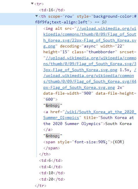 → nested 된 link인 <a> tag의 title은 "South Korea at the 2020 Summer Olympics"임 - 이를 활용하여 특정 <tr> tag를 가져올 것