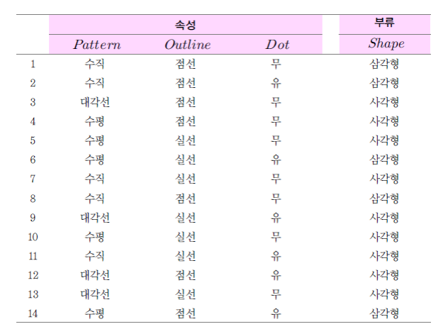 Q. 삼각형과 사각형으로 최종적으로 부류를 나누는 decision tree classifier를 만들고 싶다. 이 때 첫 분류 criteria로 pattern, outline, dot 중 중 어떤 criteria를 고를 지 Gini impurity & entropy 기준으로 각각 골라보자. 그리고 결정된 criteria 종류가 똑같은 지도 확인해보자!