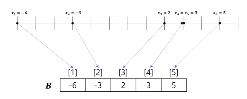 โข ์์ฑํ B ๋ฐฐ์ด์ ์ค๋ณต์์ด ์์ถํด key๋ฅผ number / value๋ฅผ index๋ก ์ ์ฅ(hash map ๊ตฌํ - O(N)) + ๋๋ binary search๋ฅผ ํ์ฉํด ๊ฐ number์ left index ๊ตฌํ๊ธฐ(O(NlogN))