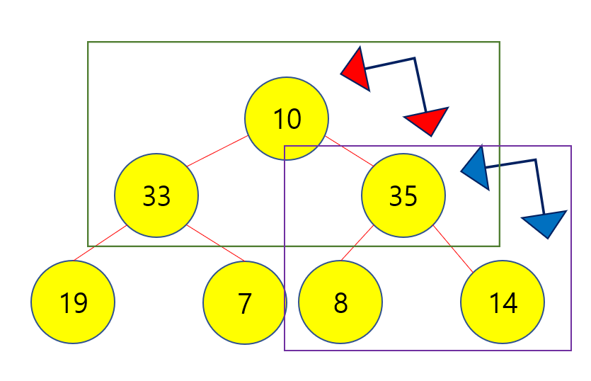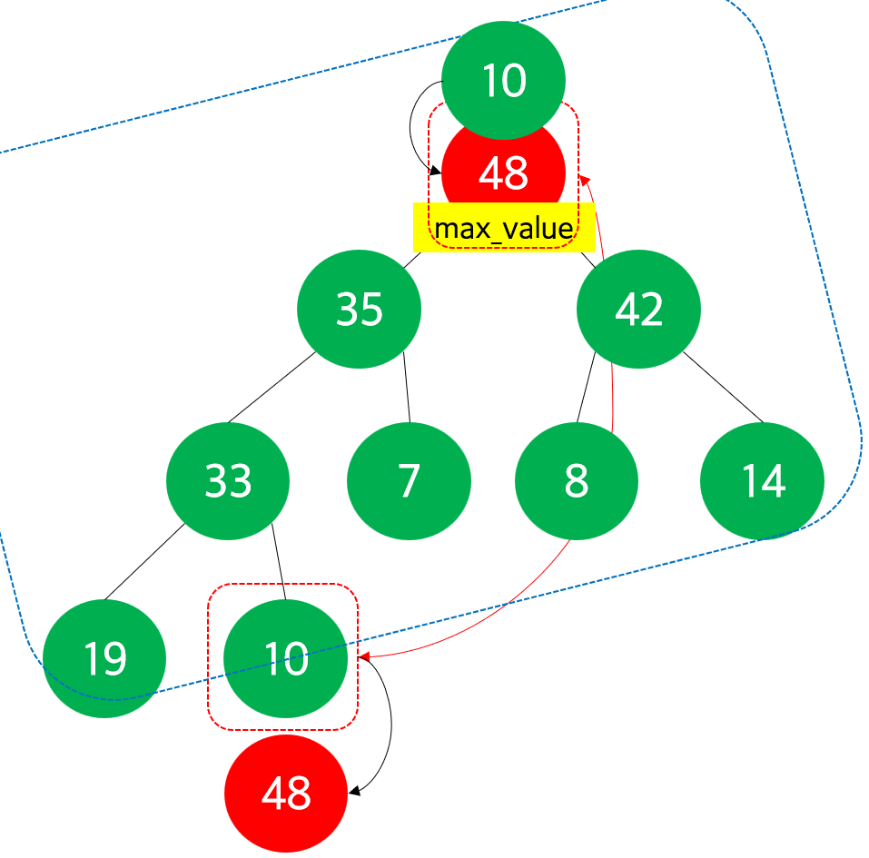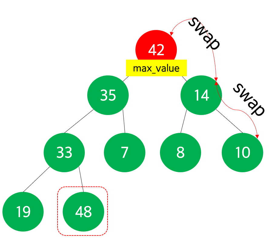 🎊 ex) array [33, 35, 42, 10, 7, 8, 14, 19, 48]이 주어졌다고 하자. heapify()의 swap 과정 그림 일부 참조.