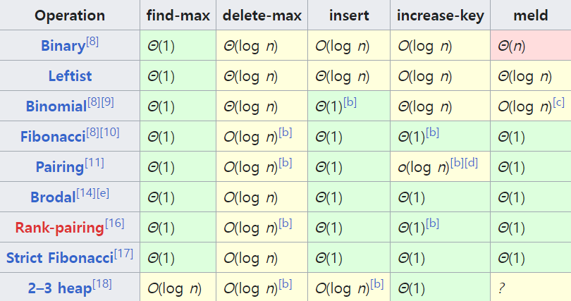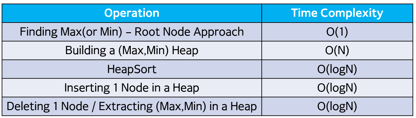 🎊 앞서 언급한 Binary Heap은 Heap Data Structure의 일종으로, binary heap외 leftis, binomial, fibonacci, pairing, brodal, rank-pairing, strict fibonacci, 2-3 heap과 같은 다양한 heap 존재. 아래와 같이 이번 포스팅에서 배울 Binary Heap은 아래 표와 같이 deletion / insertion 모두 시간 복잡도 O(logN)이다. O(N)보다 작으므로 효율적이다라는 부분에서 대표 자료구조로 많이 사용.