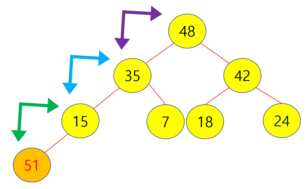 🎊 이미 완성된 heap에서 맨 마지막에 새로운 원소를 insertion할 수 있다. 이 때, max-heap의 성질을 유지하기 위해 부모 노드 원소와 계속 비교하며 최대 root node 상위까지 swap 진행. (하단 그림 참조) / 맨 마지막에 insertion 하는 이유는, sub-tree max-heap property를 계속 만족시키기 위함. (하단 그림 51을 넣었을 경우 상위 node 까지 3번 swap)