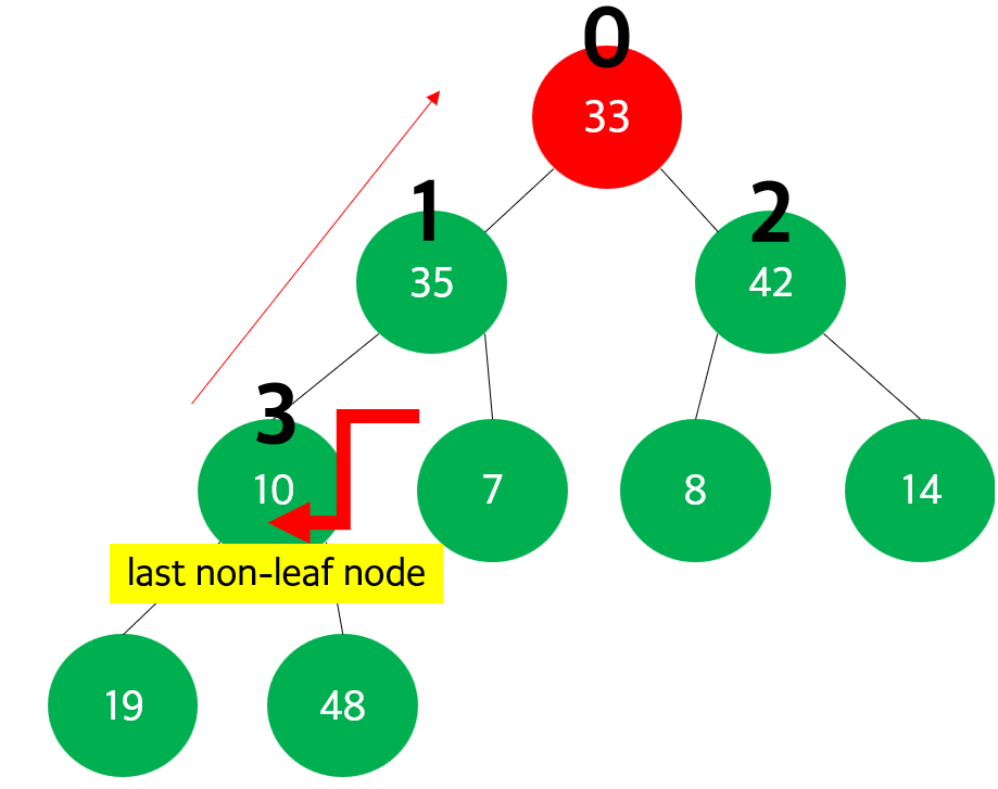 → 아래 왼쪽 그림에서 last non-leaf node (index 3) 10부터 reverse iteration 진행. (즉 index 3 - 2 - 1 - 0순으로 swap heapify() 실행)