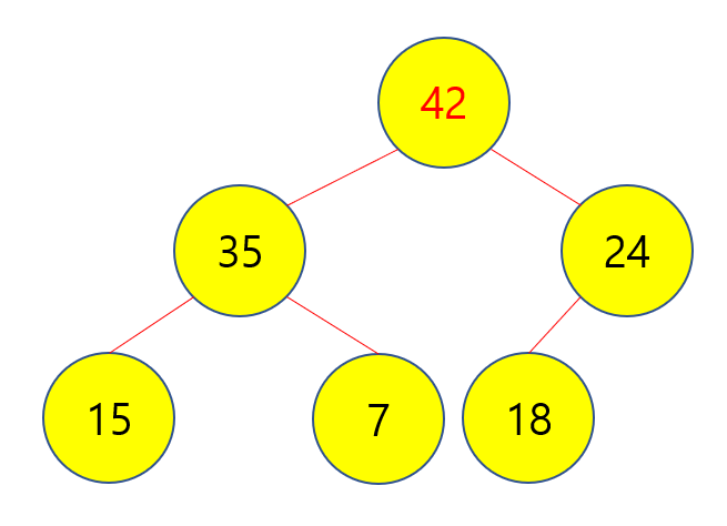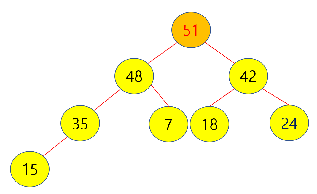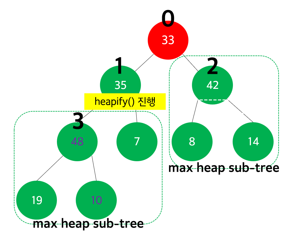 ∴ 최종 결과 heapify()의 결과로 [48, 35, 42, 33, 7, 8, 14, 19, 10] max heap 완성