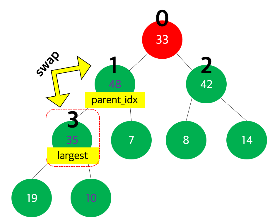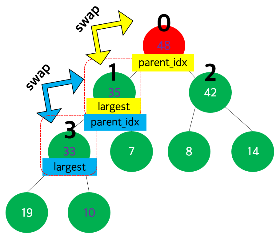 → 그 다음 줄 오른쪽 그림은 index 0일 때의 heapify() 그림. parent_idx와 largest가 다른 경우가 2번 있으므로 swap 2번 진행