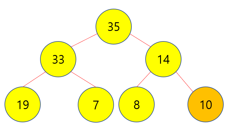 🎊 update된 max-heap을 array 형태로 표현하면 [35, 33, 14, 19, 7, 8, 10]이 된다. 이와 같이 계속해서 root-node deletion을 진행하면 제일 큰 수부터 차례대로 delete된다. 따라서, delete된 원소를 차례대로 모으면, sort된 결과가 나온다. 이 sorting을 heapsort(increasing-order)라고 부른다.