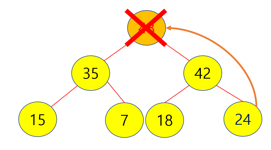 ② max heap에서 root node 빼고 root node 자리에 bottom-most right-most element 넣기 (O(1))