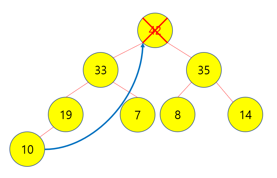 🎊 ex) 아래의 max heap에서 root node이자 전체 원소의 최댓값 42를 빼고, bottom-most right-most element 10을 맨 위에 올려 놓는다. 이 때, 항상 max-heap 구조를 유지해야 하므로, 위 ② 과정에서 제시한 heapify() 과정대로 swap 진행.
