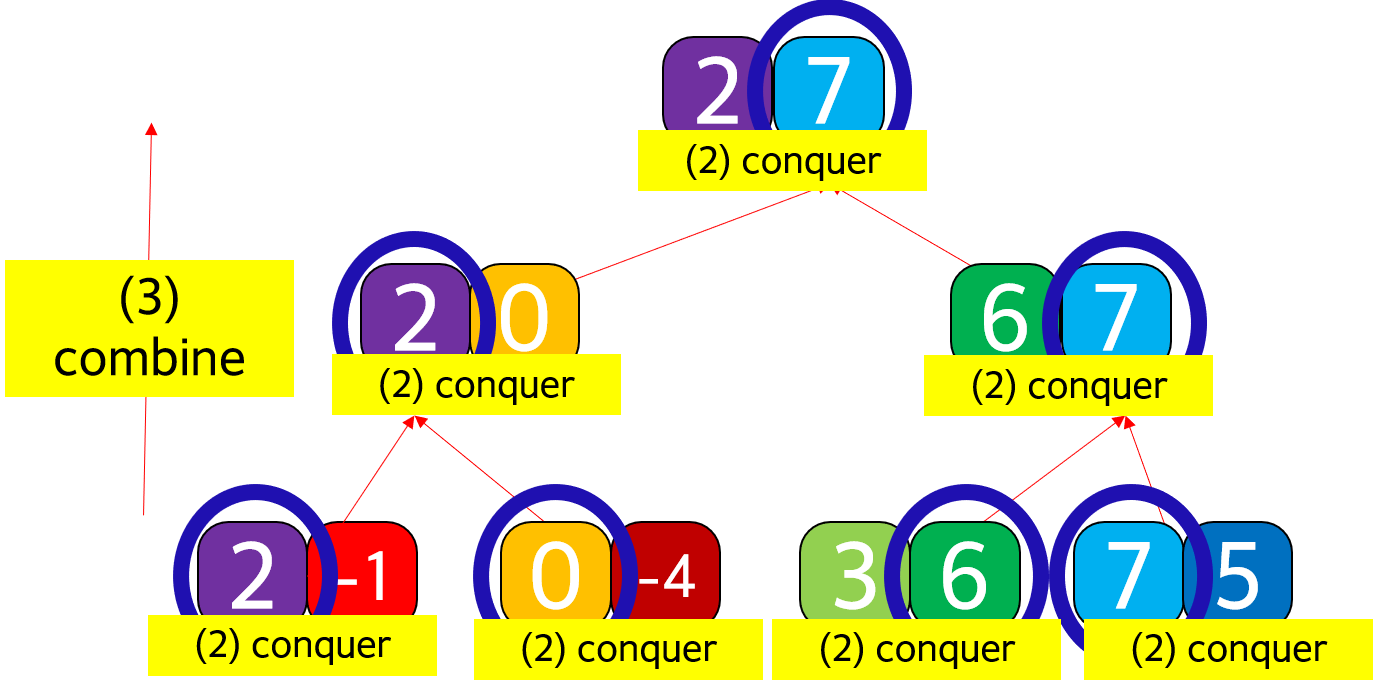 (2) conquer: ์ต์ข ์ ์ผ๋ก ๋๋์ด์ง sub-problem์ ๊ฐ list์ ์ต๋๊ฐ์ ๊ตฌํ๋ค. ์ต๋๊ฐ์ ๊ตฌํ๋ ๊ฑด max() ์ฌ์ฉ ์์ด ๋ถ๋ฑ์์ผ๋ก ์งํ