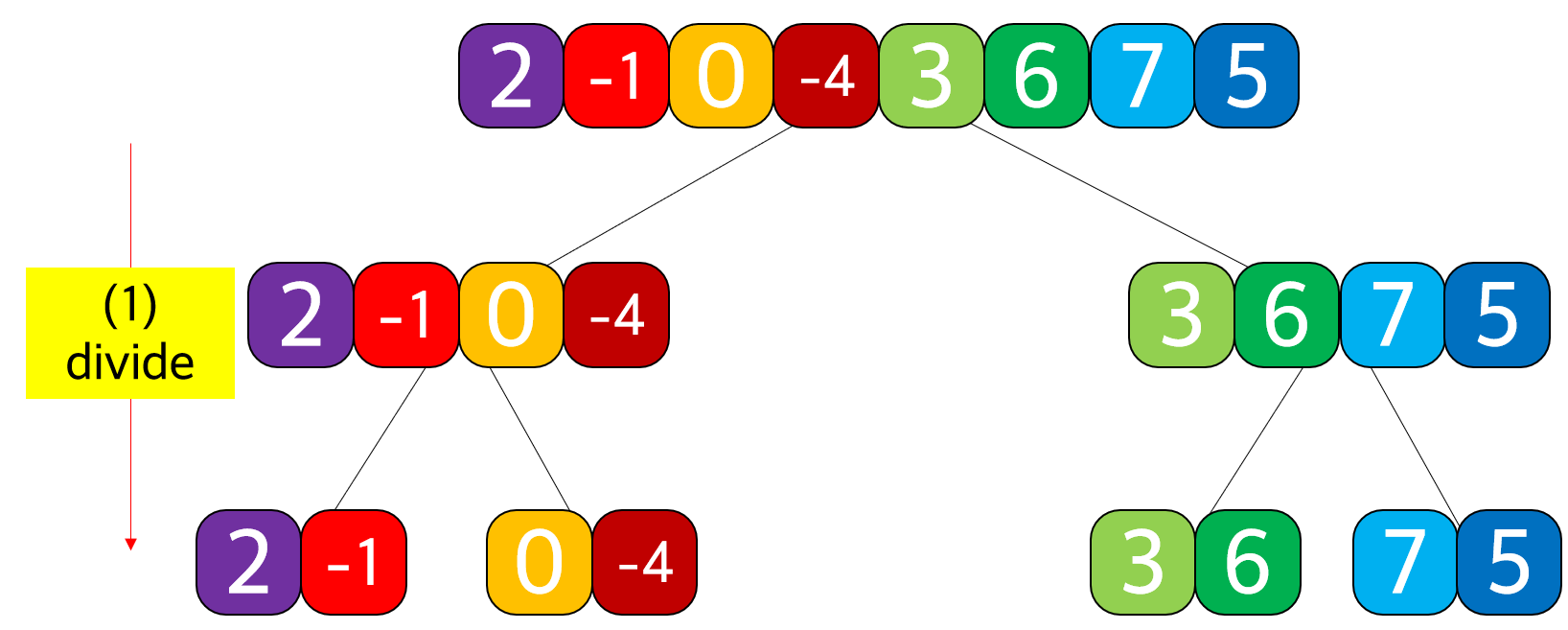 (1) divide: ์ผ๋จ ์ ์ฒด list๋ฅผ ๊ธธ์ด๊ฐ 2 ๋๋ 1์ด ๋ ๋๊น์ง ์ ๋ฐ์ผ๋ก sub-problem์ผ๋ก ๋๋์ด ๋๊ฐ๋ค
