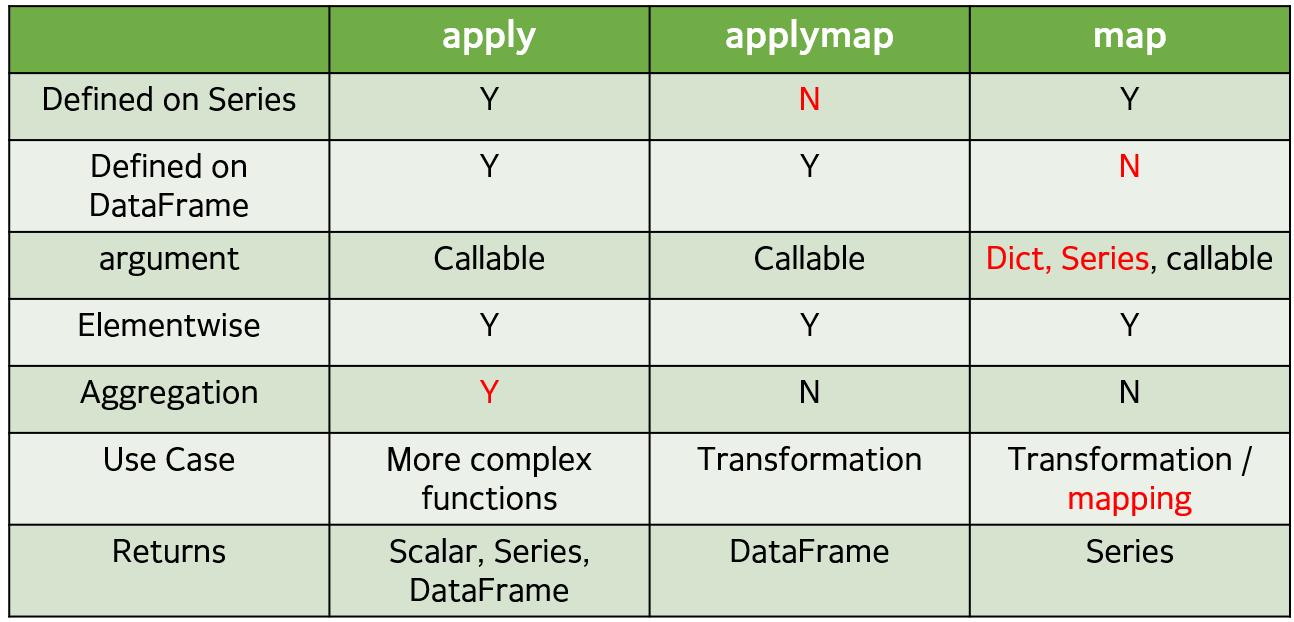 + 하지만 applymap() 함수는 각 element 별로 적용하는 함수이기 때문에 aggregating해서 각 row나 column 별로 한번에 연산을 수행하는 기능은 진행할 수 없다.