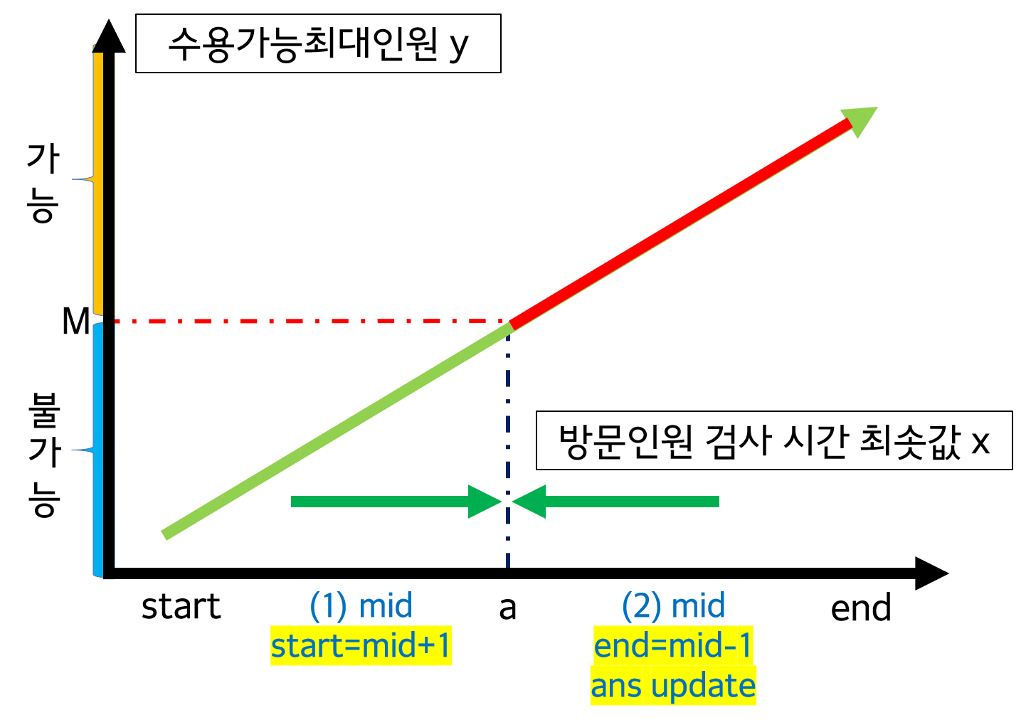 → x๋ฅผ ์ค์ด๋ฉด์ ํด๋น y๊ฐ์ด ๋ฐฉ๋ฌธํ ์ธ์ M์ ์์ฉํ ์ ์๋ ์ง(์ฆ y≥M) ํ์ธ: ์ฆ ์ด๋ถํ์์ผ๋ก x๋ฅผ ์ฐพ์ผ๋ฉด์ y≥M์ธ ์ต์ x ํ์
