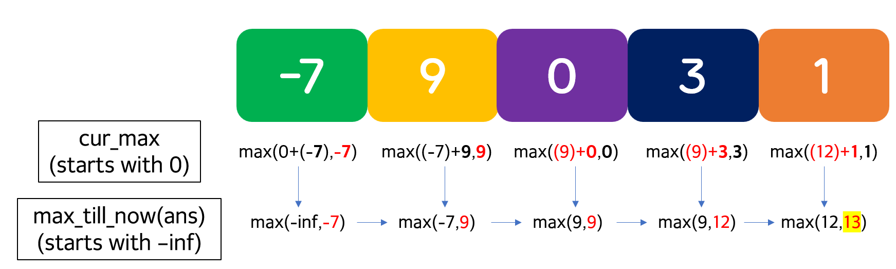 ๐ ๊ฐ element traversingํ ๋๋ง๋ค max() ๋ ๋ฒ ์ฌ์ฉ. max_till_now๋ก ์ต์ข ์ต๋๊ฐ updateํ๊ณ , cur_max๋ ํ์ฌ์์น์ ์์ only & ํ์ฌ์์น์ ์์ ํฌํจ ๊ทธ ์ ์ cur_max ํฉ ๋ ๊ฐ์ค ์ต๋๊ฐ update. ์ฆ cur_max๋ก ๊ฐ ์์๋ฅผ ํฌํจํ ๋ถ๋ถ์ฐ์์์ดํฉ ์ต๋๊ฐ์ ๊ณ์ ๊ตฌํด๋๊ฐ๋ dp ๋ฐฉ์์ด๋ ๋ง์ฐฌ๊ฐ์ง. ๋ค๋ง, dp๋ ์ต์ข ์ ์ผ๋ก max() ํ ๋ฒ ์ฌ์ฉ์ด์ง๋ง, Kadane's algorithm์์๋ max()๋ฅผ ๊ทธ ๋ ๊ทธ ๋ updateํ๋ ๋ฐฉ์๋ง ์ฐจ์ด์ . ํต์ฌ์ 'ํ์ฌ ์์น์ ์์๋ ๋ฌด์กฐ๊ฑด ๋ถ๋ถํฉ์ ํฌํจ๋ ์ํ์์ ๋ ์์ ๋ง ๊ณ ๋ คํ๋๊ฒ ๋ ํฐ ์ง, ์๋๋ฉด ์์ ์ต๋๊ฐ์ ๋ ์์ ์ ๋ํ ๊ฒฐ๊ณผ๊ฐ ํฐ ์ง'๋ฅผ ํ์ธ. ์ฒซ cur_max๋ 0์ผ๋ก ์ค์ . max_till_now๋ ๋ฌธ์ ์์ ์ฃผ์ด์ง ๋ฒ์์ ๋ฐ๋ผ ์ ์ฒด array์ ์ต์๊ฐ์ผ๋ก ์ค์