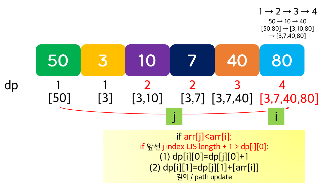 🍝 위 dp에 길이 정보 + path 정보까지 같이 update 해나가면 된다. 다만 array[j] < array[i] 조건과(LIS 조건), dp[j][0] + 1 < dp[i][0](앞선 LIS 길이보다 더 큰 sequence 등장) 두 가지 조건만 만족하면 된다. path update는 현재 원소 array[i]를 해당 array D[j][1]에 붙여주면 된다.