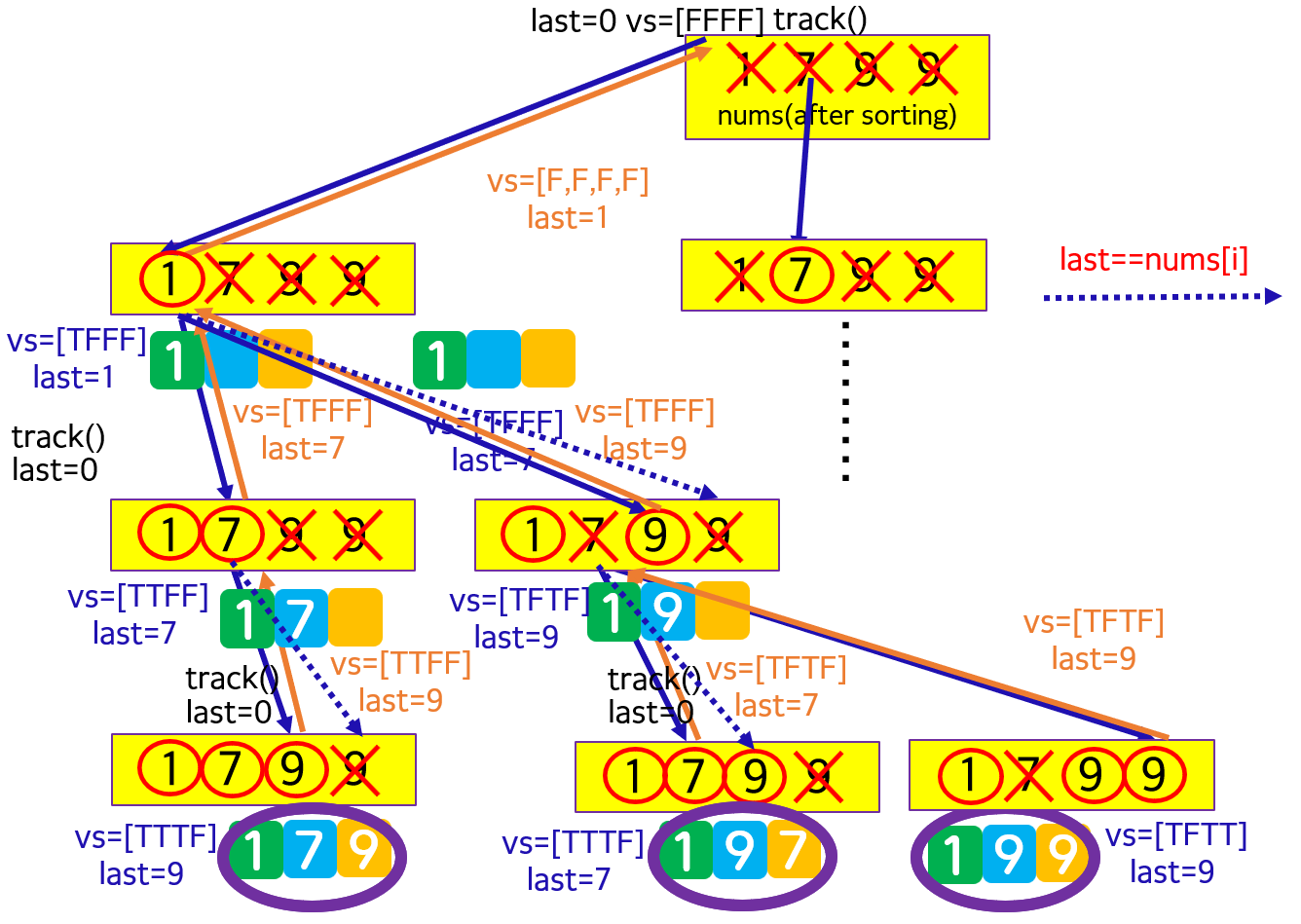 ๐ ์ฌ๊ท์ ์ผ๋ก ๋๋ backtracking์์ ์ฃผ์ด์ง ๋ฐฐ์ด์์ ์์ฐ์๋ ์ต๋ 1๋ฒ๋ง ์ฐ์ด๊ณ ์์ด ์ค๋ณต ๋ฐฉ์ง๋ฅผ ์ํด ์์ ๊ธฐ์ด backtracking์์ ์ฅ์น๋ฅผ ๋ช ๊ฐ์ง ๋ ๋ง๋ค์ด์ฃผ์ด์ผ ํ๋ค. (1) visited [] ์ฌ์ฉํ์ฌ not visitedํ ๊ณณ๋ง ์ฌ๊ท ์งํ. ์ด ๋ ์ฌ๊ท ์ visited = True ์ค์ ํ๊ณ , ์ฌ๊ท ํจ์ ์๋ซ์ค, ์ฆ ์ฌ๊ท ์ดํ์๋ pop()๊ณผ ํจ๊ป visited = False ๊ผญ ์ค์ ํ์ (์ด์ ์ํ๋ก ๋๋๋ฆฌ๊ธฐ์ด๋ฏ๋ก) / (2) ์์ด ์ค๋ณต ๋ฐฉ์ง๋ฅผ ์ํด ๋ฐ๋ก ์์ ์์, ์ฆ ๋ง์ง๋ง ์์ last๋ง ๋น๊ตํ๋ฉด ๋๋ค. ๊ทธ ์ด์ ๋ ์ฌ๊ท์ ํน์ฑ์, ๋ฐ๋ก ์์ ์์์ ๊ฐ์ง ์๋ค๋ฉด ๊ทธ ์๋ ์ญ ํ์์ ์ํด์ฃผ๊ธฐ ๋๋ฌธ.