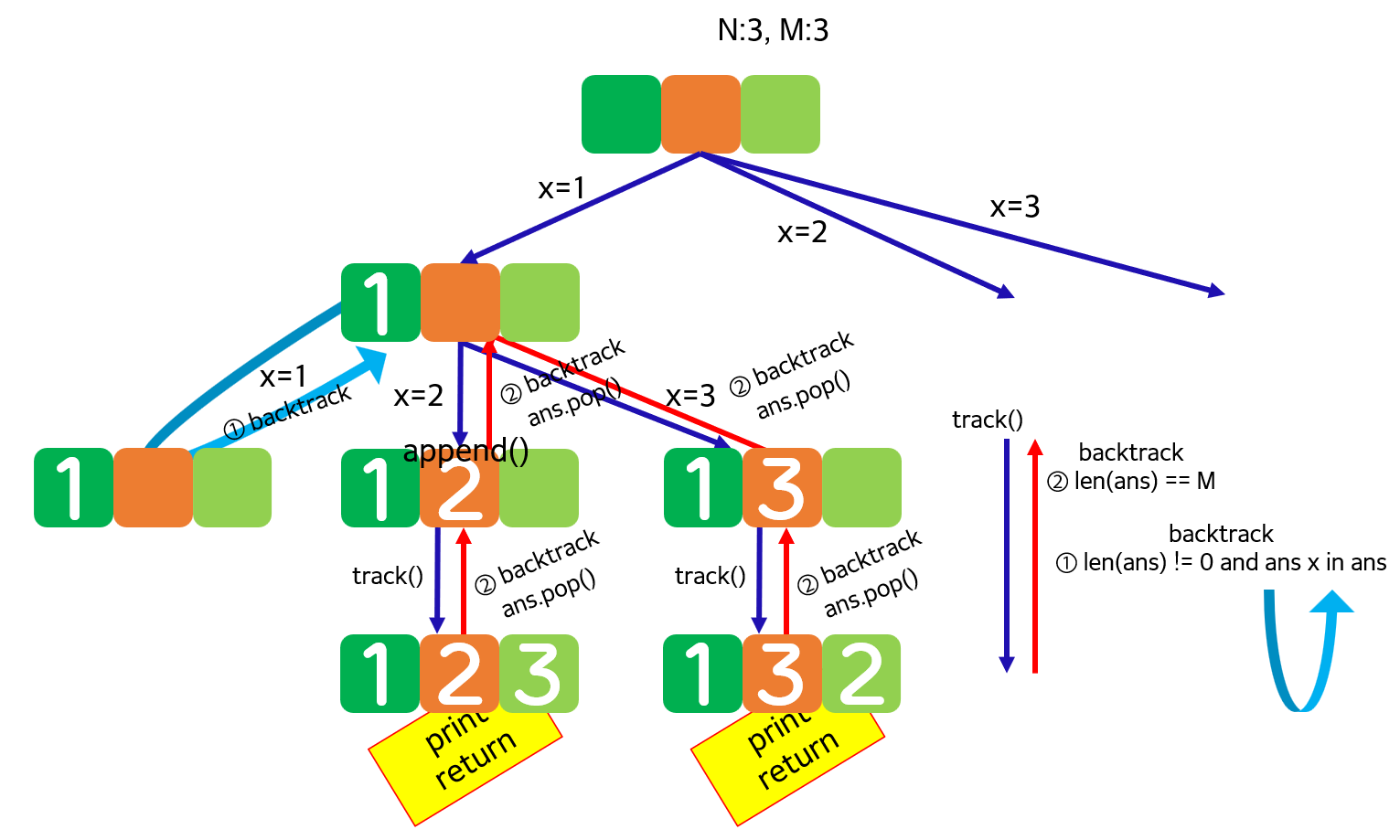 → ๋ ๊ฐ์ง ์ข ๋ฅ์ backtracking โ ๋์ค์ ์กฐ๊ฑด์ ๋ง์ง ์์ ๋ฐ๋ก ์๋ก ์ฌ๋ผ๊ฐ๋ backtracking / โก ์ ๋ต์ ๋ชจ๋ ๊ตฌํด ํด๋น case๊ฐ ๋ค ๋๋ ๋ค์ ์ฌ๋ผ๊ฐ๋ backtracking: ์ด ๋ ๋ค์ ์ฌ๋ผ๊ฐ๊ธฐ ์ํด์ ์ ์์์ ๊ฐ์ด ans.pop()๊ณผ ๊ฐ์ ์ฅ์น track() ์ดํ ๋ง๋ค์ด์ค์ผ ํ๋ค.