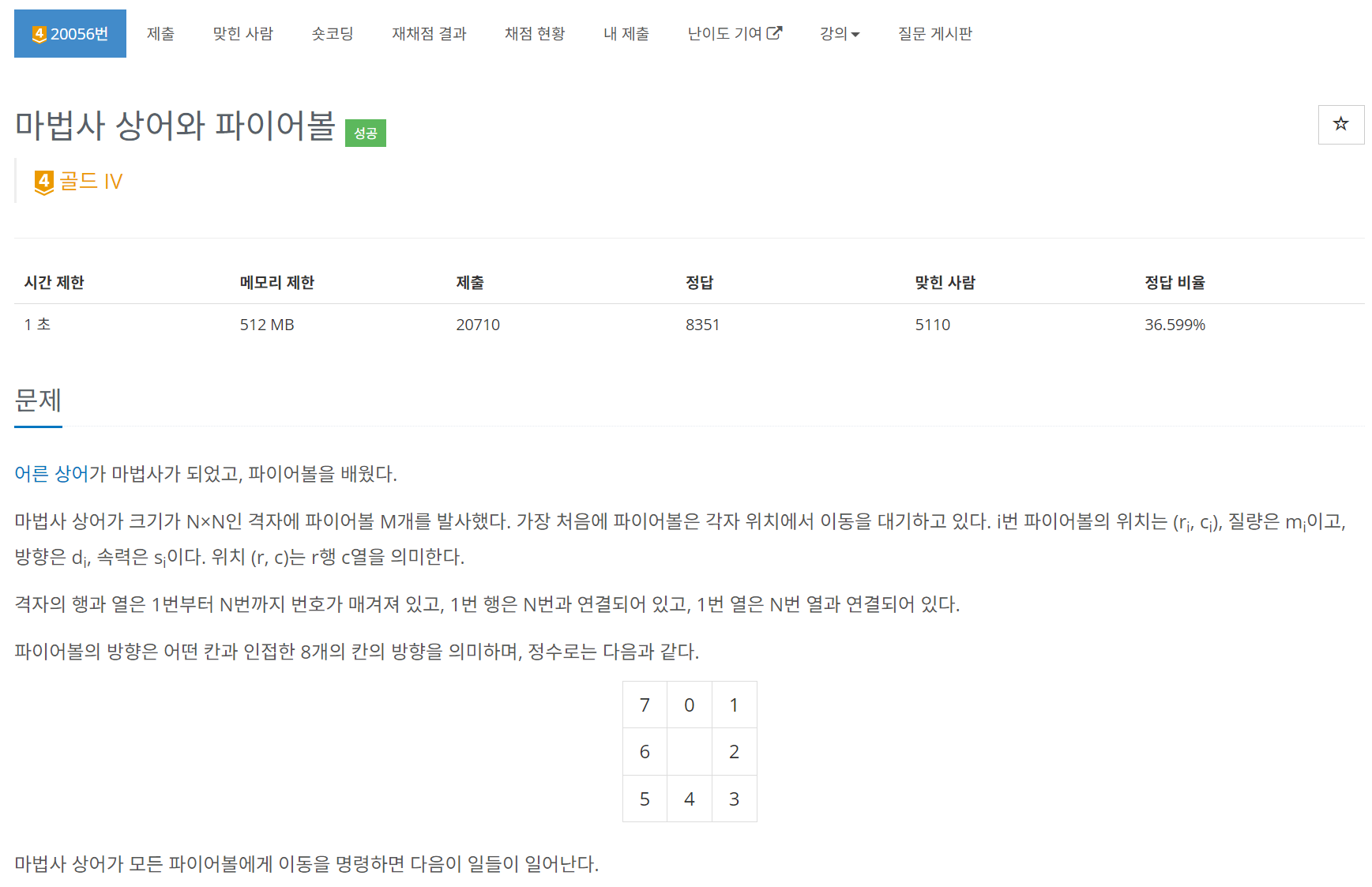 ⑤ 이후 fireballs_grouping을 돌면서 해당 key값 list에 1개만 있다면 다시 fireballs_grouped에 넣기 / 2개 이상이라면 해당 key값 list 돌면서 질량 m, 속력 s, 방향 d update(이 때 update된 m이 0보다 클 경우만 취급 / 0보다 크다면 d를 update할 때 짝수의 개수만큼 +1, 즉 0 또는 list 개수만큼 d값이 나온다면 전부 홀수/짝수이므로 이 때는 0, 2, 4, 6 방향을 가진 4개 fireball deque에 append / 아니면 1, 3, 5, 7 방향을 가진 4개 fireball deque에 append)
