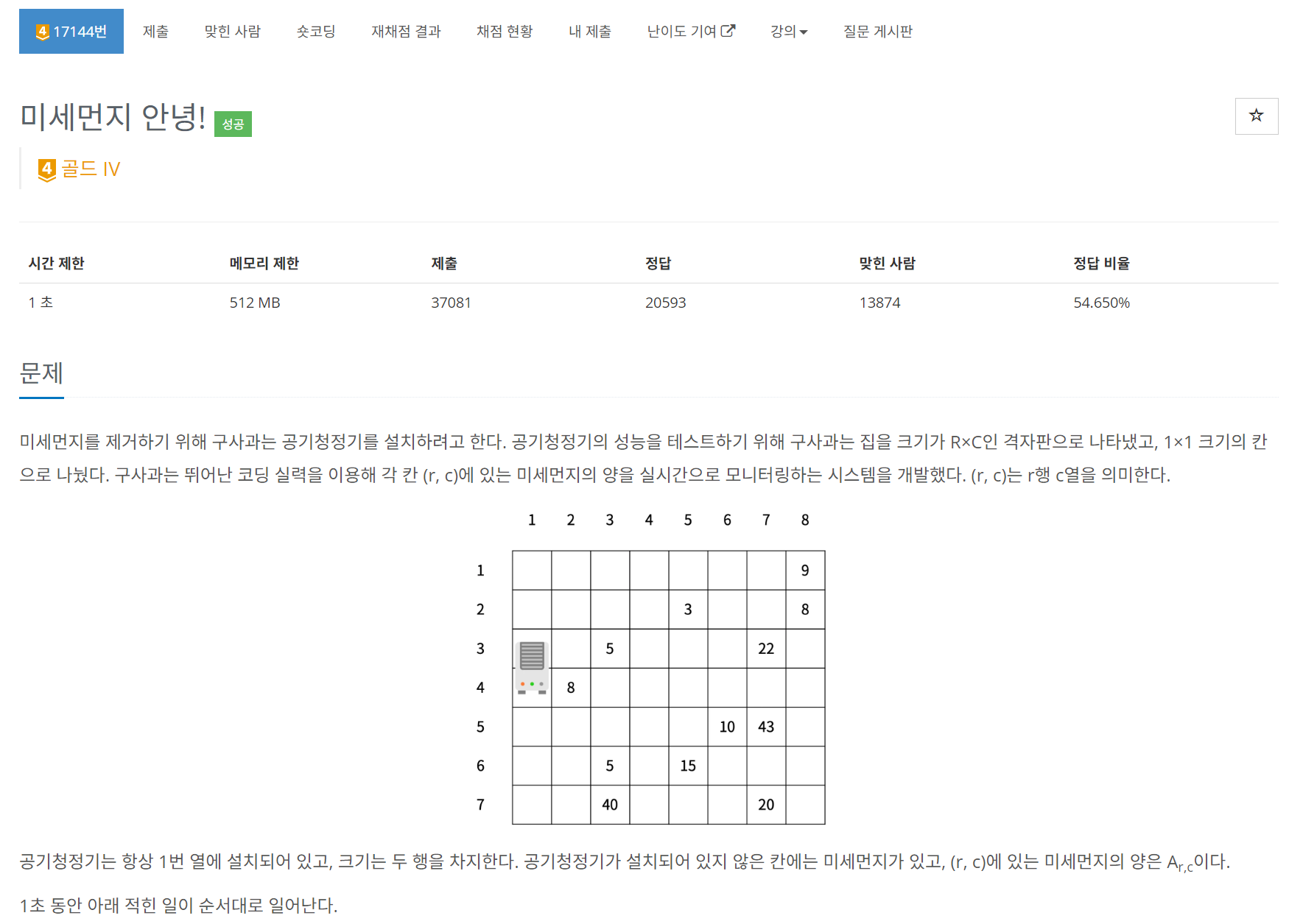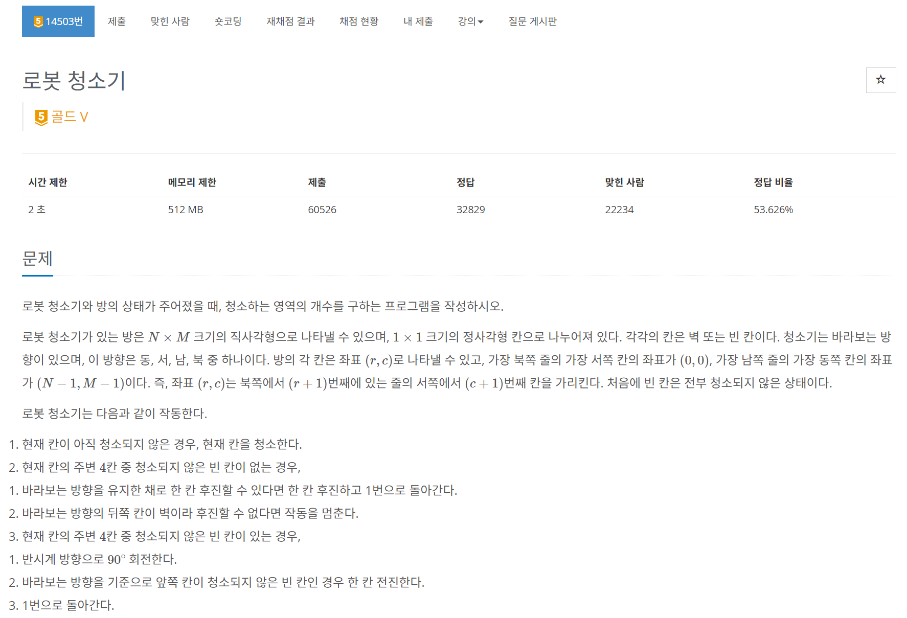 🥶 청소 유무 visited 배열 사용 + 주변이 벽이 아닌 case 중 청소 여부 개수에 따라 진행 + back으로 진행하는 방향벡터 bdx / bdy + 90도 시계반대방향으로 돌며 확인. 찾으면 break로 바로 진행