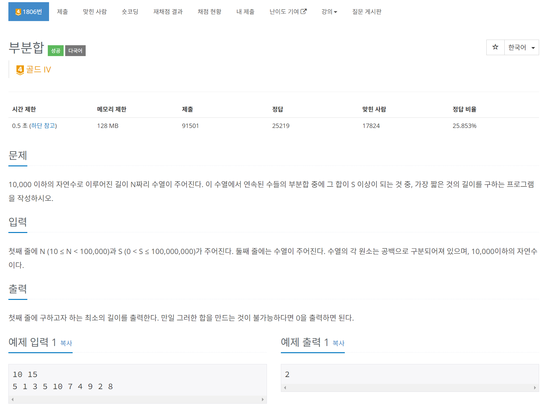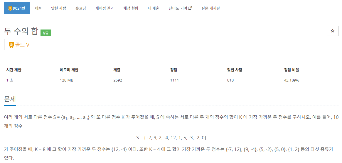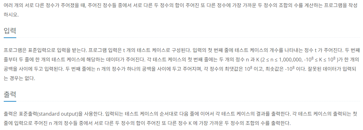 ๐งฆ ๋ ์์ ํฉ์ด K์ ๊ฐ์ฅ ๊ฐ๊น์ด ๋ ์์ ์์ ๊ฐ์๋ฅผ ๊ตฌํ๋ ๋ฌธ์