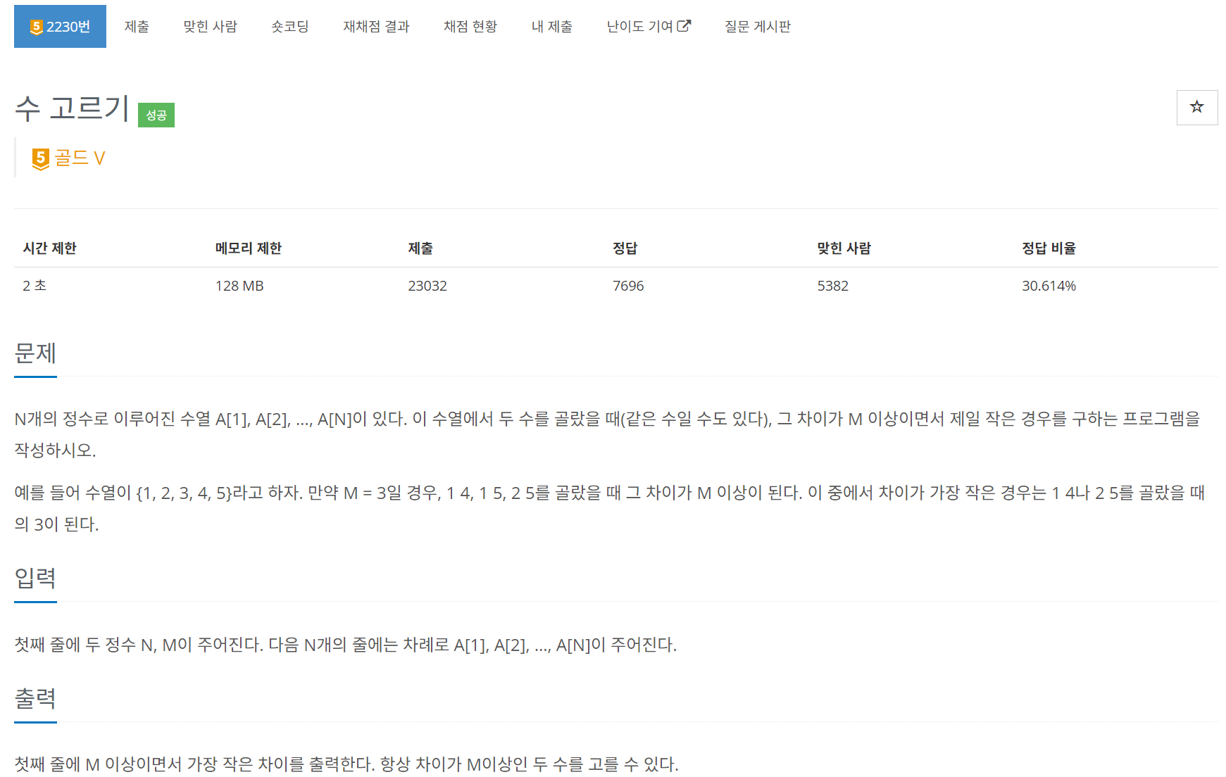 ๐งฆ ๋ ํฌ์ธํฐ๋ฅผ ์ผ์ชฝ์์ ์์ํด์ ๋ ์์ ์ฐจ์ด๊ฐ M ์ด์์ด๋ฉด์ ์ ์ผ ์์ ์ฐจ์ด๋ฅผ ๊ตฌํ๋ ๋ฌธ์ .