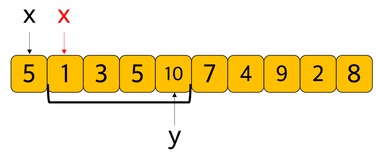๐งฆ x์ y ๋ ํฌ์ธํฐ ๋ชจ๋ ์ผ์ชฝ ๋๋ถํฐ ์์ํ๋ฉฐ, y๊ฐ ์ค๋ฅธ์ชฝ์ผ๋ก ์ด๋ํ๋ฉฐ ๋์ ํฉ์ด S์ด์์ด ๋ ๋๊น์ง ์งํ. x๊ฐ ์ค๋ฅธ์ชฝ์ผ๋ก ์ด๋์, y๊ฐ ์ฒ์๋ถํฐ ์งํํ ํ์ ์์. ๋์ ํฉ์ด๋ฏ๋ก, ๊ธฐ์กด x๊ฐ ๊ฐ๋ฆฌํค๋ ์์๊ฐ ๋น ์ ธ S์ด์์ด ๋ ๋ฆฌ ์๊ธฐ ๋๋ฌธ(ํฌ ํฌ์ธํฐ ์๊ณ ๋ฆฌ์ฆ ์ ์ฉ). ์๋ ๊ทธ๋ฆผ ์ฐธ์กฐ
