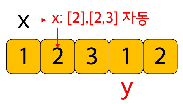 ๐งฆ y๊ฐ 1๋ก ๋ฉ์ถ ์ํ์์ x๊ฐ 2๋ก ์์ง์์ ๋, ์ด์ฐจํผ ์งํํ ๋ถ๋ถ๊น์ง๋ ์ด๋ฏธ ๋ชจ๋ ์ค๋ณต๋ ์์๊ฐ ์์์ด ์ฆ๋ช ๋์์ผ๋ฏ๋ก(๊ทธ๋ฌ๋๊น y๊ฐ ์ด๋ํ ๊ฒ์ด๋ฏ๋ก) x๊ฐ 2์ผ ๋ 2๋ก ์์ํ๋ ๋ถ๋ถ์ฐ์์์ด(์ค๋ณต ์๋ ์์) [2], [2,3]์ ๊ฐ์ y-x๋ก ๊ตณ์ด y ๋ค์ ์์์ ์ถ๋ฐ ํ์ ์์ด ans์ ์๋์ผ๋ก ๊ฐ์ ๋ํ๋ฉด ๋๋ค.