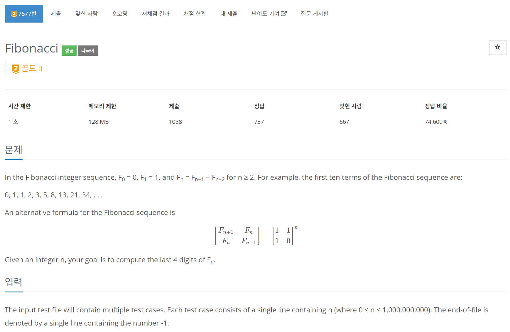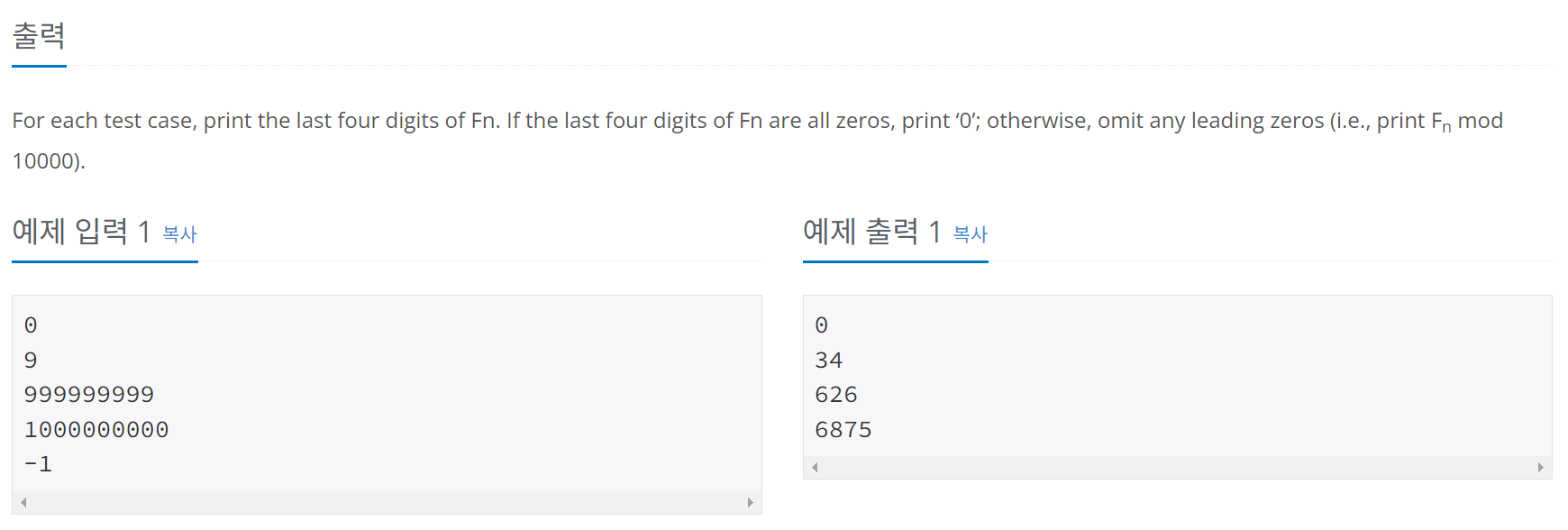 ๐ง ๋๊ฐ์ด 10^9์ผ๋ก ๋๋ Fibonacci ์ O(logn)๋ง์ ๊ตฌํ๋ฉด ๋๋ค.