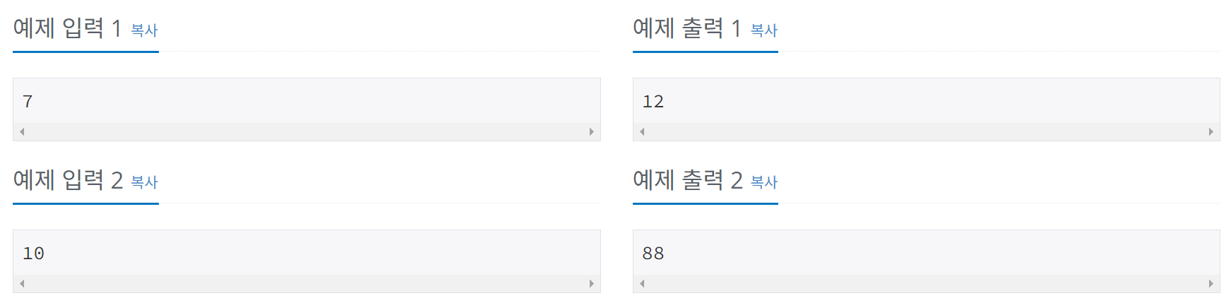 ๐ง F1๋ถํฐ Fn๊น์ง์ ํ์๋ฒ์งธ ํผ๋ณด๋์น ์์ ํฉ์ n์ด ํ์์ผ ๊ฒฝ์ฐ F(n+1), n์ด ์ง์์ผ ๊ฒฝ์ฐ F(n)์ผ๋ก ๊ตฌํ๋ฉด ๋๋ค. (ํผ๋ณด๋์น ํฌ์คํ ์ฆ๋ช ์ฐธ์กฐ) ์ด ๋ F ํผ๋ณด๋์น ๊ฐ์ ํ๋ ฌ์ ๋ถํ ์ ๋ณต ๊ฑฐ๋ญ์ ๊ณฑ ์๊ณ ๋ฆฌ์ฆ์ ํ์ฉํด O(logn)๋ง์ ๊ตฌํ๋ฉด ๋๋ค.
