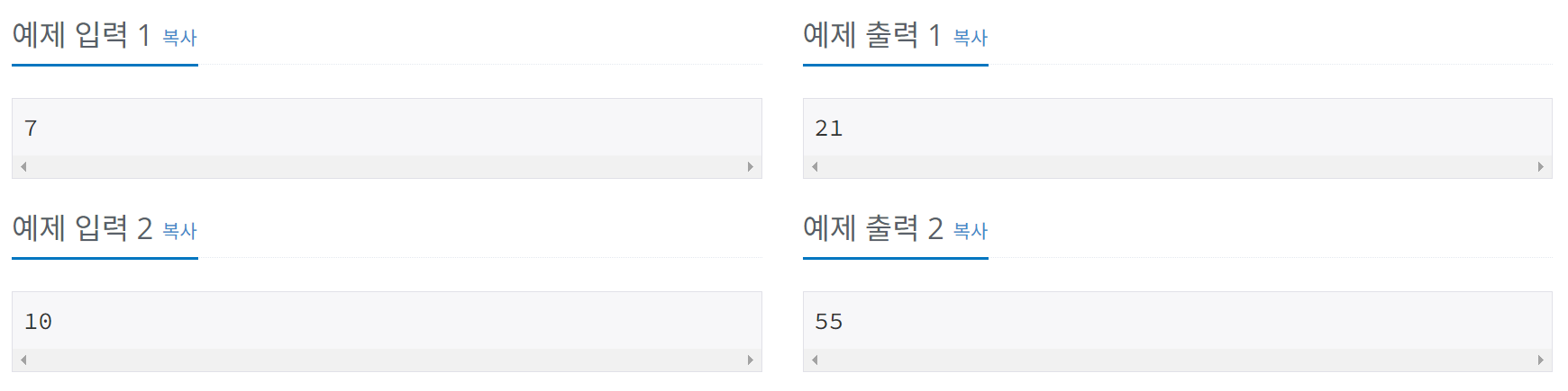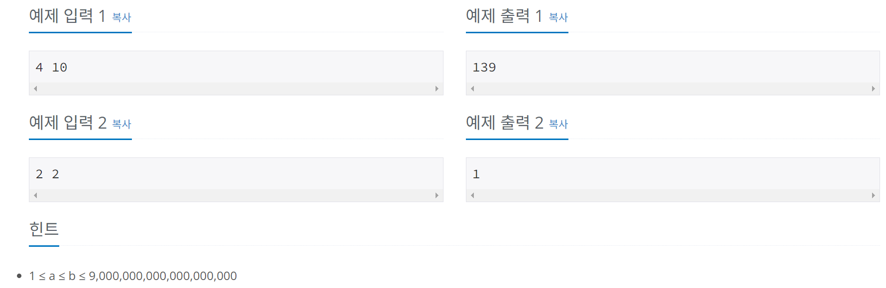 ๐ง a๋ฒ์งธ ํญ๋ถํฐ b๋ฒ์งธ ํญ๊น์ง์ ํผ๋ณด๋์น ์์ ๋ชจ๋ ํฉ์ b๋ฒ์งธ ํญ๊น์ง์ ํผ๋ณด๋์น ์์ ํฉ์์ (a-1)๋ฒ์งธ ํญ๊น์ง์ ํผ๋ณด๋์น ์์ ํฉ์ ๋นผ๋ฉด ๋๋ค. ๋บ ๊ฒฐ๊ณผ๊ฐ 0๋ณด๋ค ์๋ค๋ฉด ans์์ ๋นผ์ ๊ตฌํ๋ฉด ๋๋ค. ์ด ๋ n๋ฒ์งธ ํญ๊น์ง์ ํผ๋ณด๋์น ์์ ํฉ์ F(n+2)-1 ์ฌ์ฉ