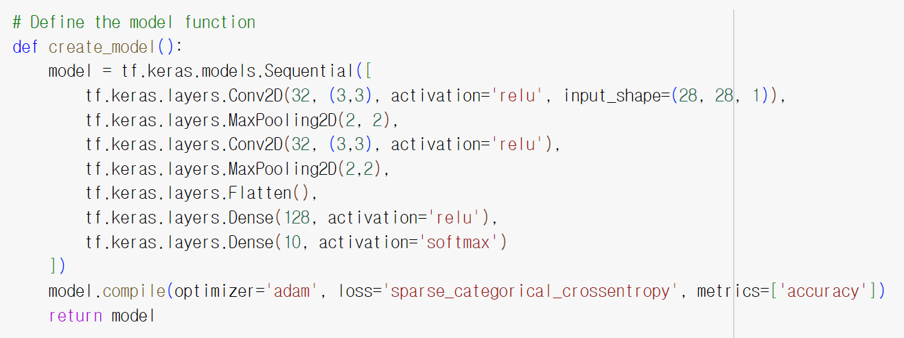๐ default fashionMNIST Classifier ๋ชจ๋ธ: <Convolution((3,3) x 32) + MaxPooling(2,2)> 2๊ฐ ์ฐ์ฐ → Flatten() → Dense(128, relu) → Dense(10, softmax)