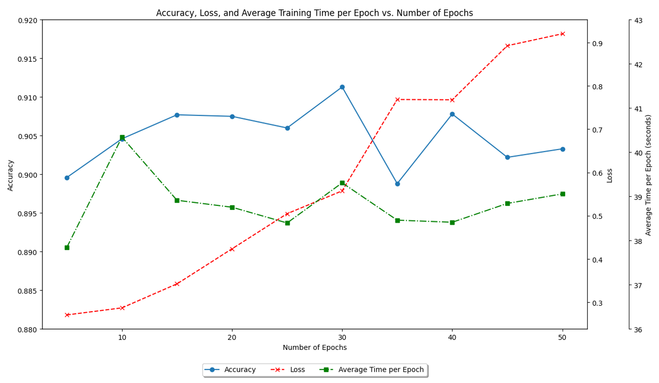 ๐ Convolution๊ณผ Pooling์ ์ ์ฉํ fashionMNIST Classifier์ epochs๋ฅผ ์กฐ์ ํ๋ฉด์ accuracy in evaluation, loss in evaluation ๊ทธ๋ฆฌ๊ณ average training time per epoch์ ์ด๋ค ๋ณํ๊ฐ ์๊ธฐ๋ ์ง ๊ทธ๋ํ๋ก ์๊ฐํ ํด๋ณด์. epochs๋ฅผ 5๋ถํฐ 50๊น์ง 5๋จ์๋ก ์ฆ๊ฐํ๋ฉด์ 3๊ฐ metrics์ ๋ณํ๋ฅผ ์ดํด๋ณด์๋ค.