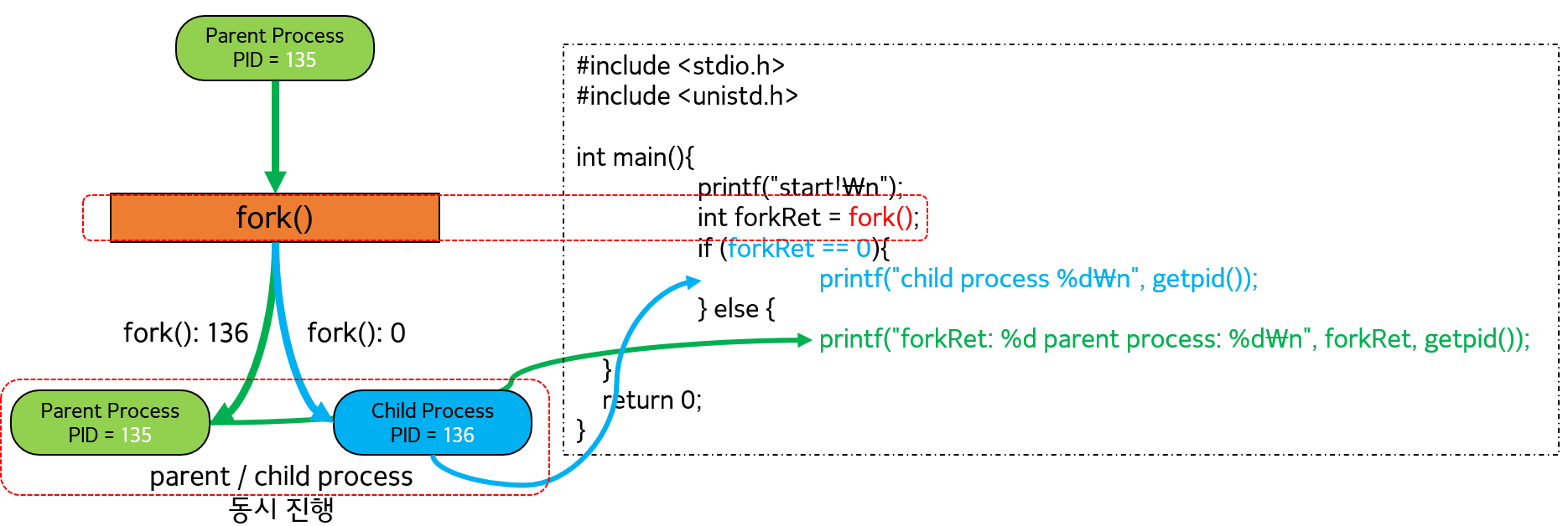 printf("forkRet: %d parent process: %d\n", forkRet, getpid());