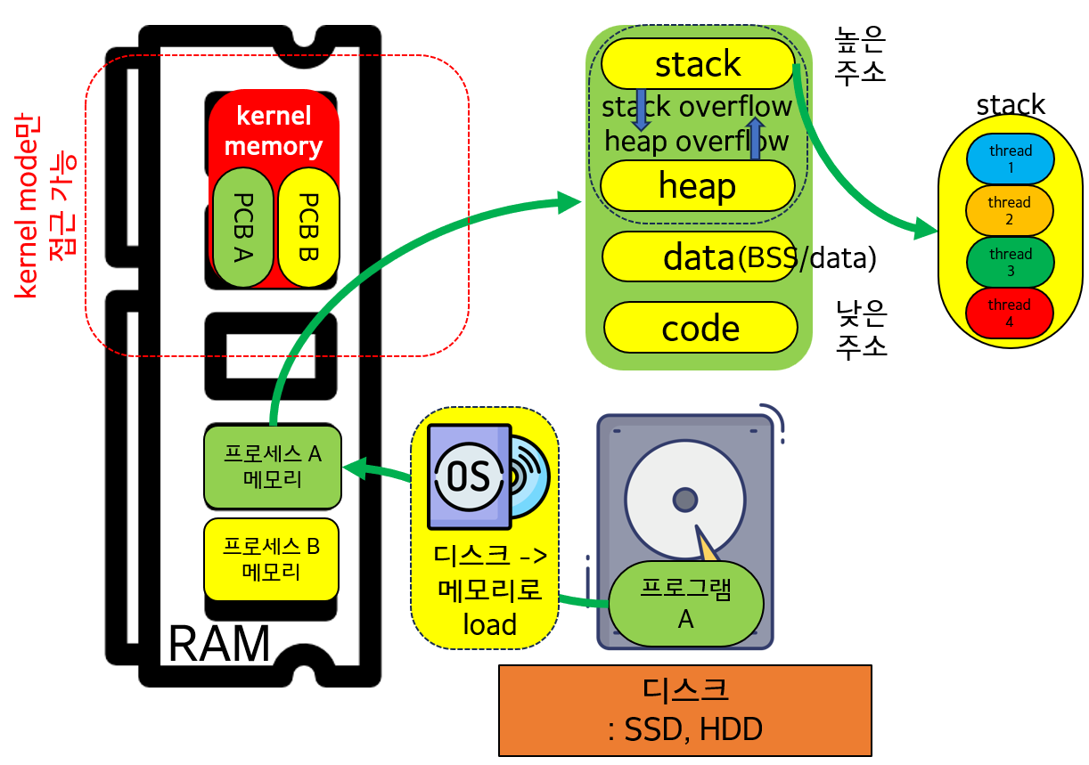 ๐ Process: ์ปดํจํฐ์์ ์คํ์ค์ธ ํ๋์ ํ๋ก๊ทธ๋จ. ํ๋ก๊ทธ๋จ์ ํน์ ์์ ์ ์ํํ๊ธฐ ์ํ ๋ช ๋ น์ด์ ์งํฉ. ๊ฐ ํ๋ก์ธ์ค๋ง๋ค RAM์ ๋ ๋ฆฝ๋ ๋ฉ๋ชจ๋ฆฌ ์์ญ(์ฝ๋, ๋ฐ์ดํฐ, ํ, ์คํ)์ ํ ๋น ๋ฐ๋๋ค. ๋ฐ๋ผ์ ๋ค๋ฅธ ํ๋ก์ธ์ค์ ๋ฉ๋ชจ๋ฆฌ ์์ญ์ ์กด์ฌํ ์ ์๋ค(์ ํ๋ก์ธ์ค A ์ฐ๋์ ๋ฉ๋ชจ๋ฆฌ์ ํ๋ก์ธ์ค B ๋ ธ๋์ ๋ฉ๋ชจ๋ฆฌ๊ฐ ๋ณ๋๋ก ์กด์ฌํ๋ค)