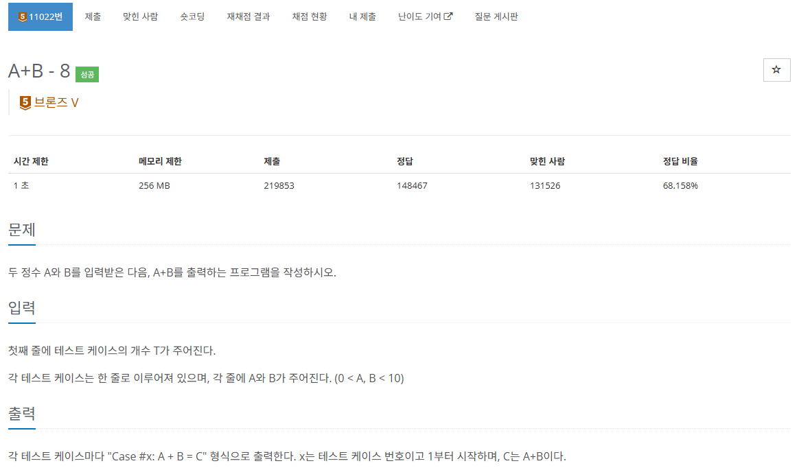 cout << "Case #" << i+1 << ": " << A << " + " << B << " = " << A + B << '\n';