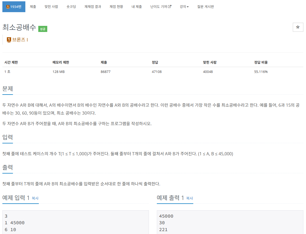 ๐งโ๏ธ ์ ํด๋ฆฌ๋ ํธ์ ๋ฒ(ํฐ ์๋ ์์ ์๋ก, ์์ ์๋ ํฐ ์๋ฅผ ์์ ์๋ก ๋๋ ๋๋จธ์ง / ๊ทธ๋ฆฌ๊ณ ์์ ์๊ฐ 0์ด ๋ ๋๊น์ง ๋๋ฆฌ๊ธฐ)์ผ๋ก ๋ ์์ ์ต๋๊ณต์ฝ์๋ฅผ ๊ตฌํ๊ณ , A x B = G x L ๊ณต์์ ํ์ฉํด ์ต์๊ณต๋ฐฐ์ L์ ์ถ๋ ฅํ๋ฉด ๋๋ค.