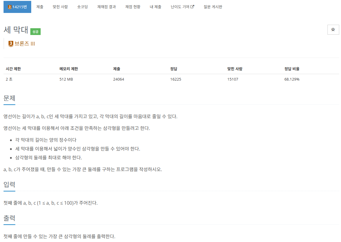 🤙 삼각형의 결정조건을 만족하면 주어진 길이 모두 사용할 수 있으므로 바로 출력 / 그렇지 않다면 작은 두 변의 길이의 합 - 1을 가장 큰 길이로 해서 최대한 주어진 길이 모두 사용하게 설정.