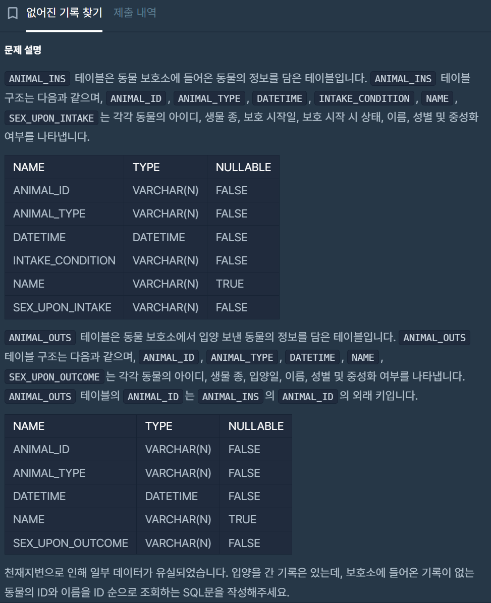 ✨ LEFT JOIN 필요) 테이블 B는 없는 ANIMAL_ID이되, 테이블 A에는 있어야 하므로. 특히 B에는 없는 A에서의 ANIMAL_ID여야 하기에 그렇다.