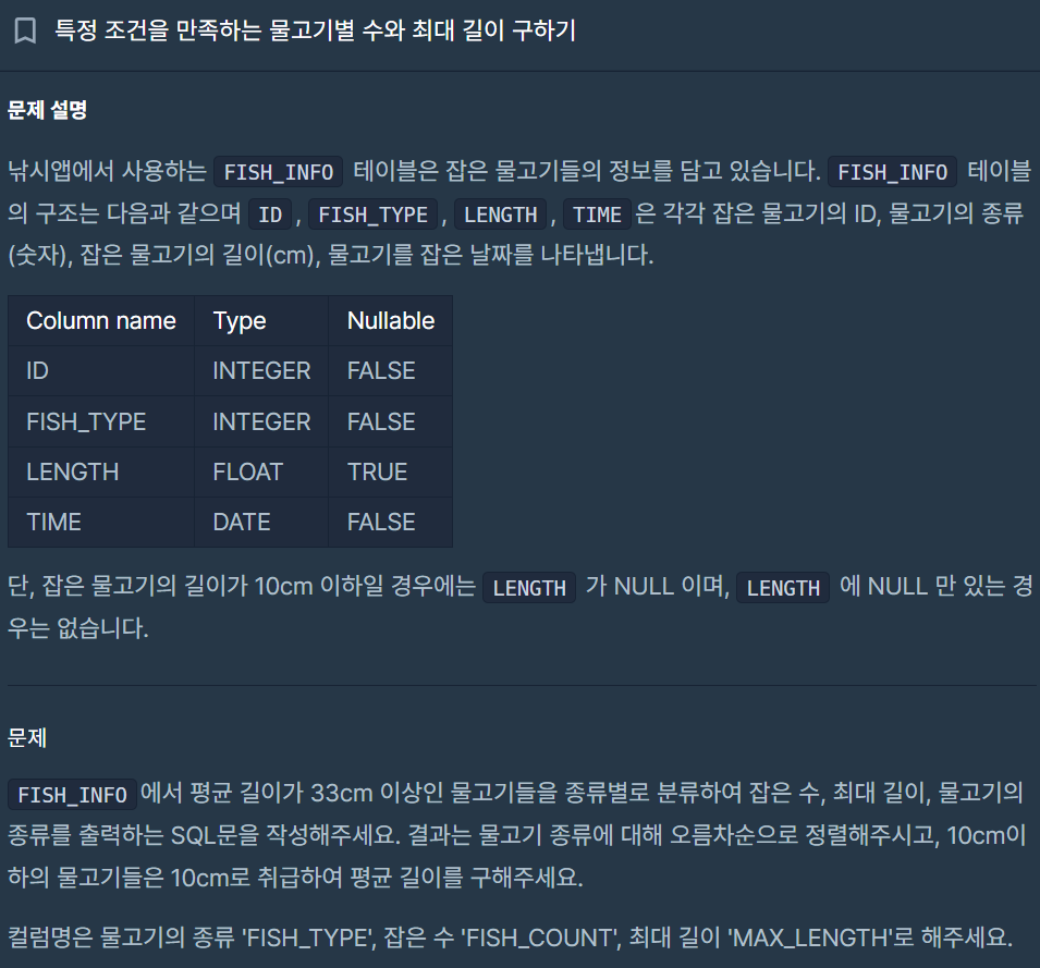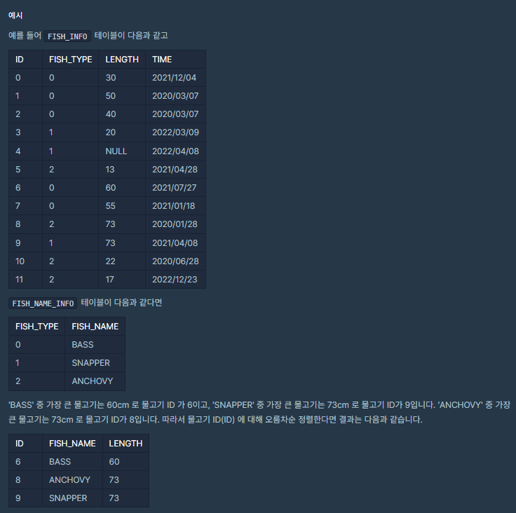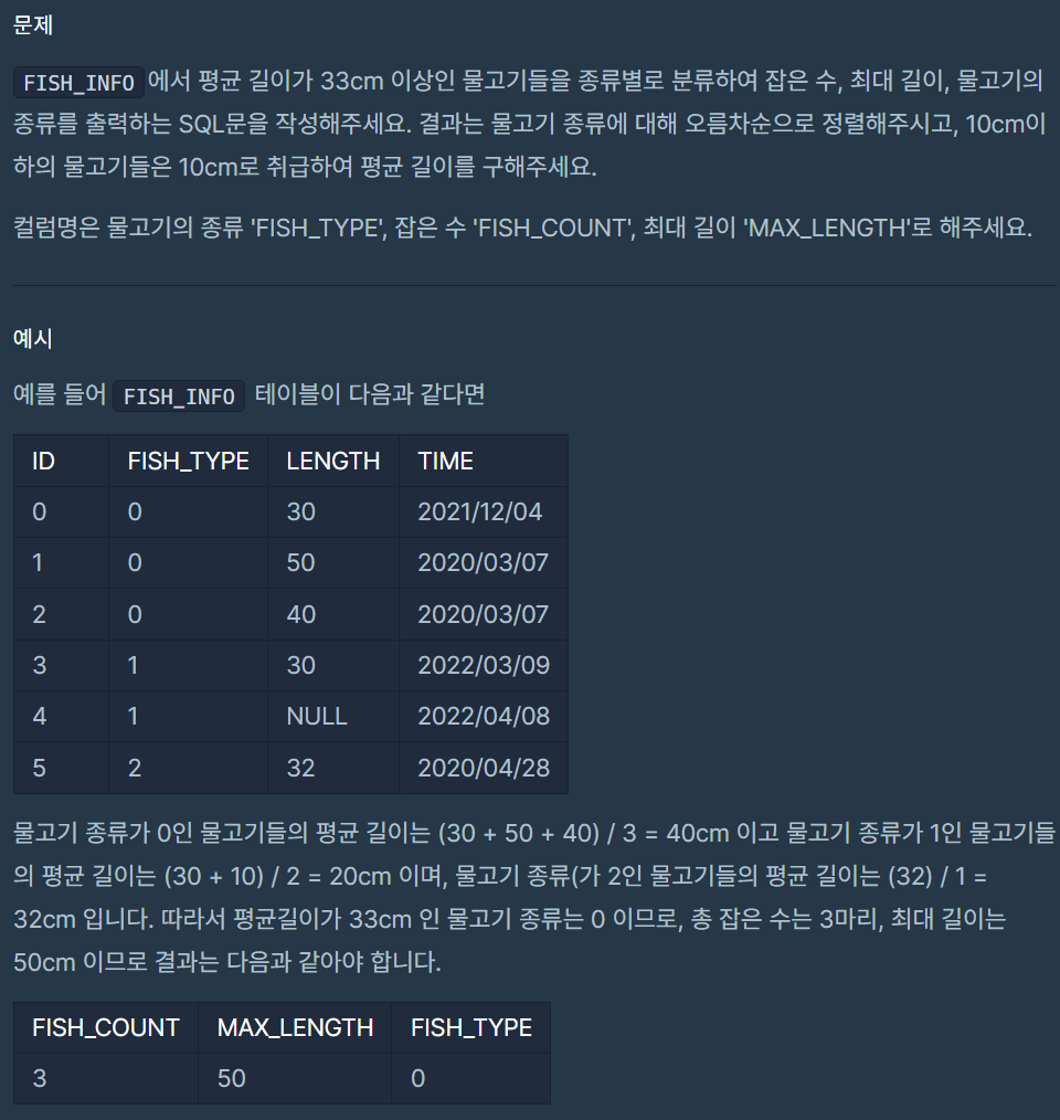 (2) WHERE문에 sub-query로 A.FISH_TYPE이 GROUP BY로 그룹화된 결과의 MAX(LENGTH)일 때의 FISH_TYPE 경우일 때만의 row data에서의 column을 select해서 출력