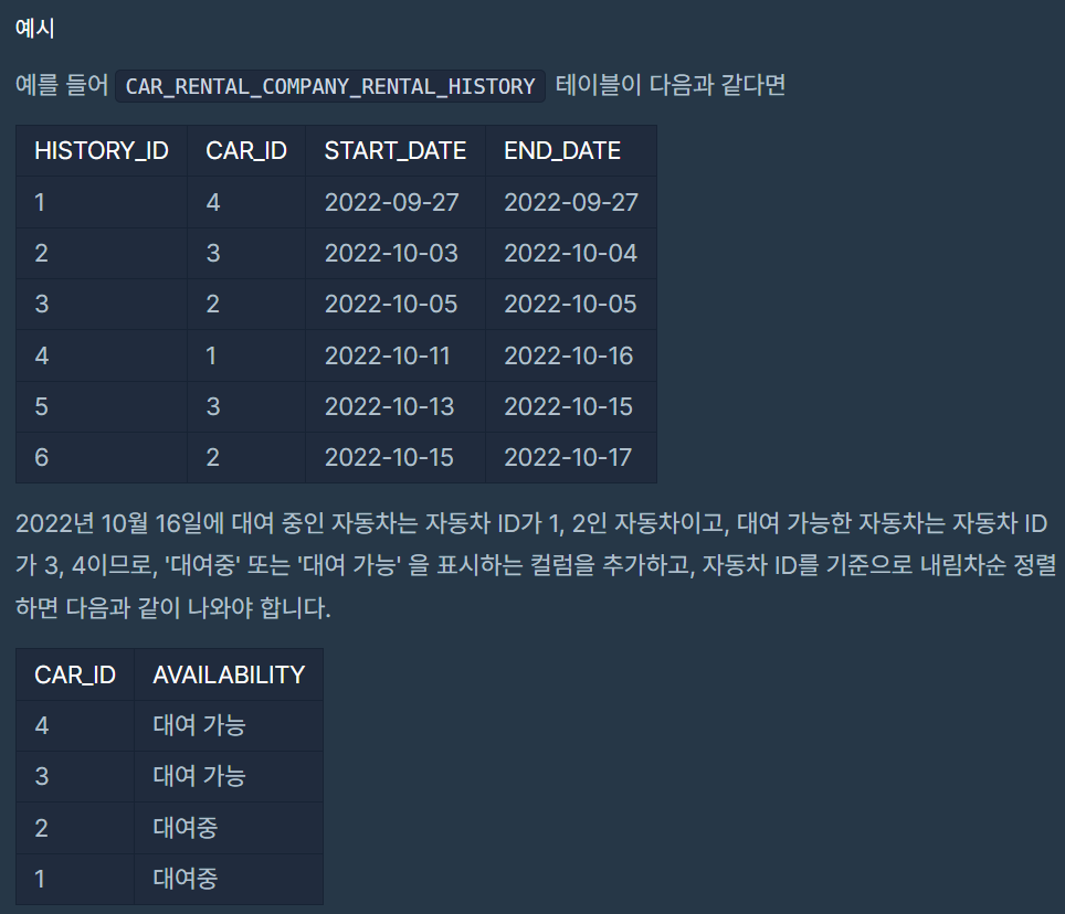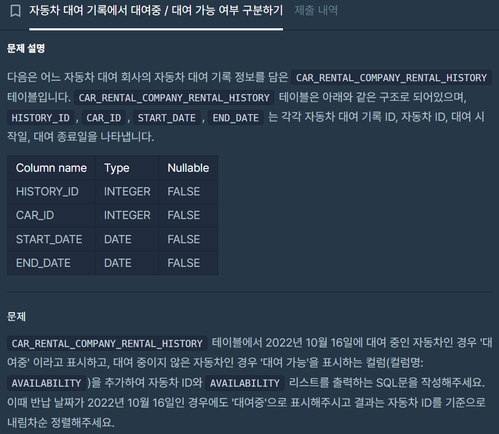 * BETWEEN 구문을 쓰면 START_DATE와 END_DATE 모두 포함. CAR_ID IN (SELECT CAR_ID ~ ) 서브쿼리 구문 사용해서 IN 구문으로 2022년 10월 16일이 포함된 CAR_ID에 들어 있는 지 확인. 들어 있다면, CASE 문으로 '대여중', ELSE 문으로 '대여 가능'