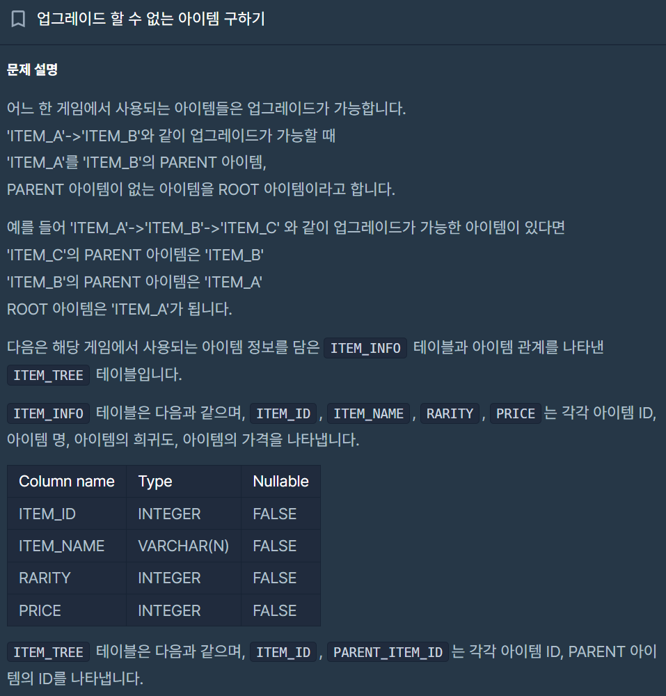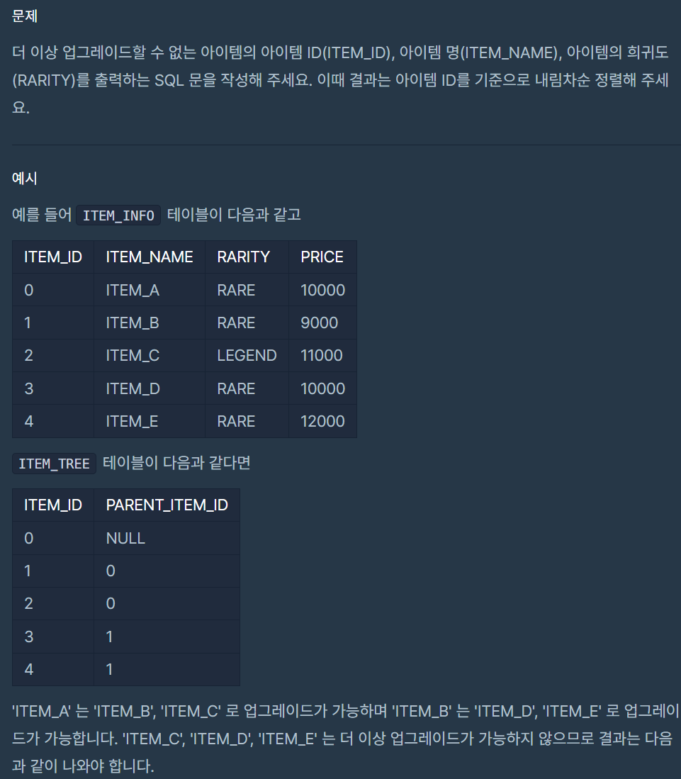 ✨ 문제를 읽어보면, 업그레이드 할 수 없는 아이템은 PARENT_ID에 없는 ITEM_ID인 경우이다.