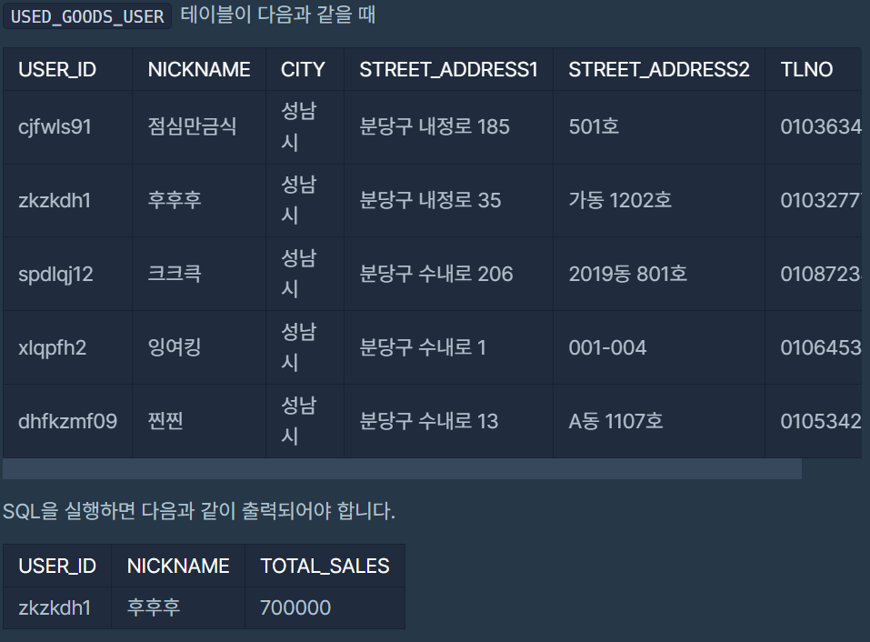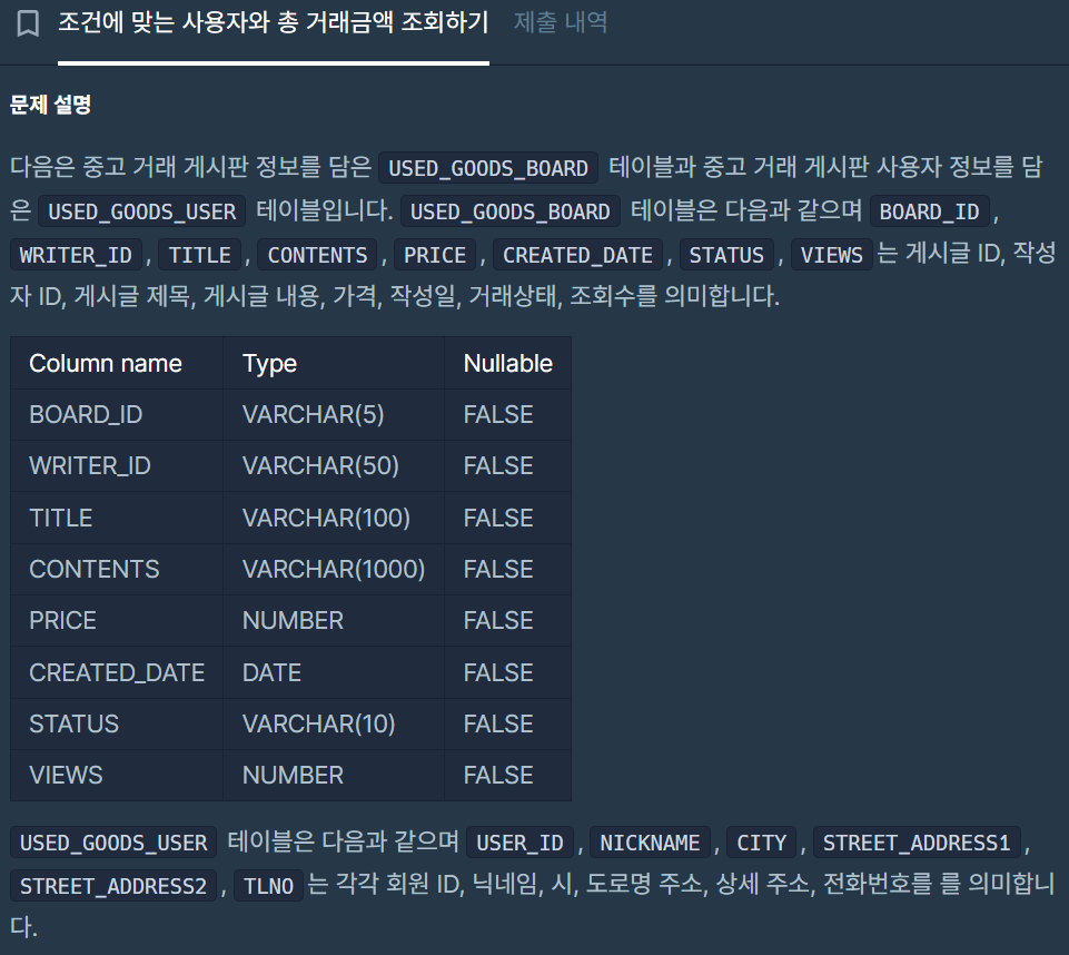 008. 조건에 맞는 사용자와 총 거래금액 조회하기