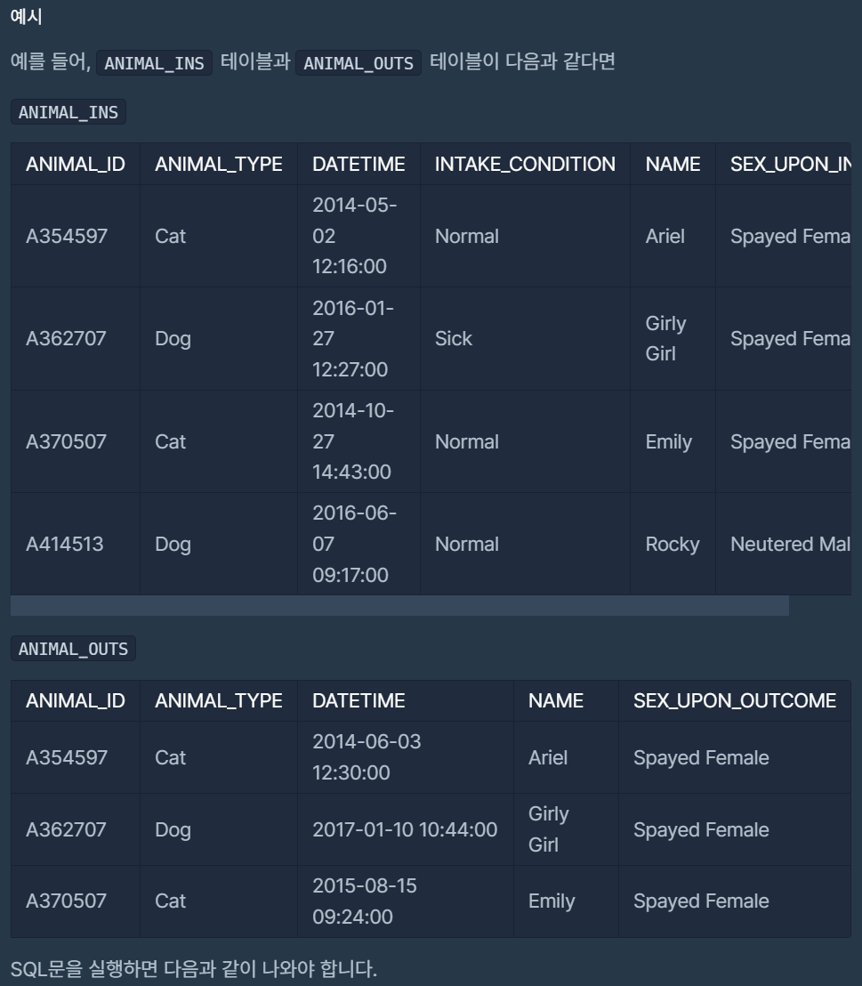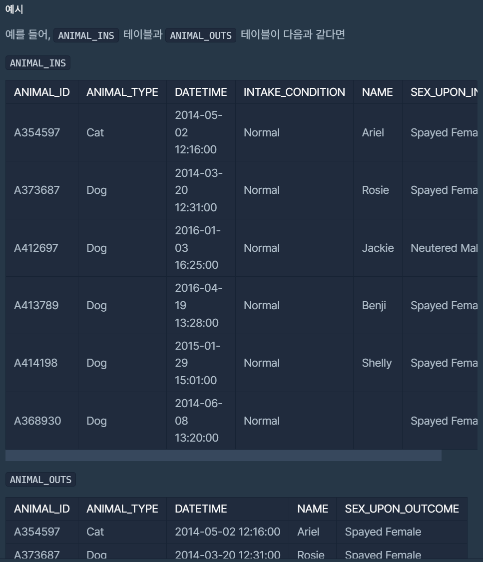 WHERE ANIMAL_INS.DATETIME > ANIMAL_OUTS.DATETIME