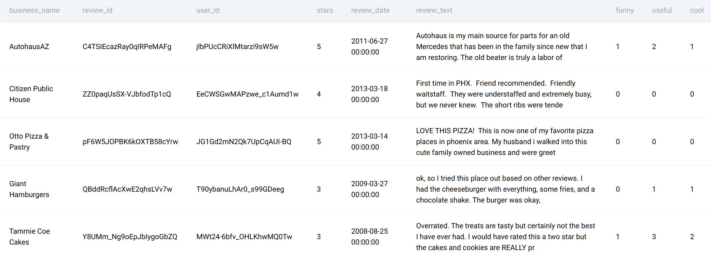 ๐ฅ Q. ๊ฐ์ฅ ๋์ cool votes ๋ฐ์ ํ(more or equal than 1)์ busines_name๊ณผ review_text ๋ ํ์ ๋ชจ์ dataframe ํํ๋ก ์ถ๋ ฅ