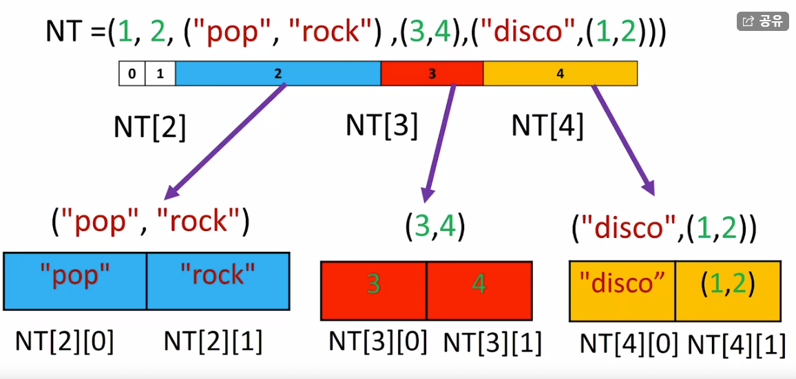 : can access strings in the second nested tuples using a third index (NT[2][1][0] = 'r')