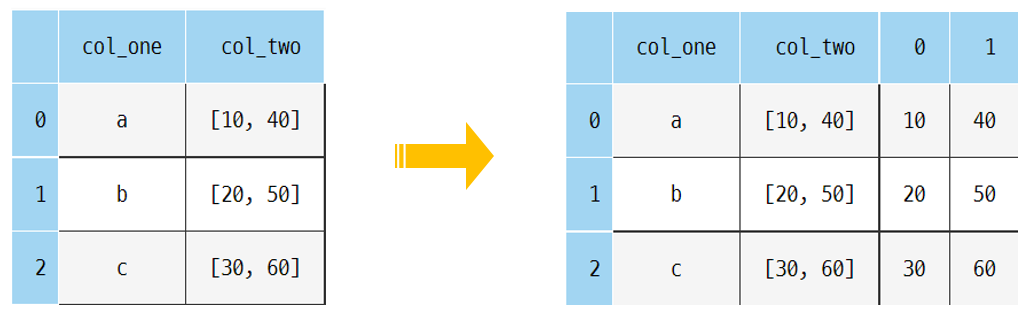 → ์ํ๋ column col_two์์ pd.Series๋ฅผ ํ์ฉํ๋ค (list๋ด์ ์์๋ค์ Seriesํํ๋ก ๋ณํํด ๊ฐ๋ณ column๋ค๋ก ๋ง๋ค์ด์ค!)