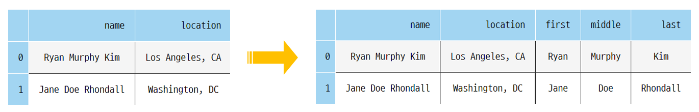 A) .column_name.str method๋ฅผ ํ์ฉํ์ฌ split ์ ์ฉ → expand = True