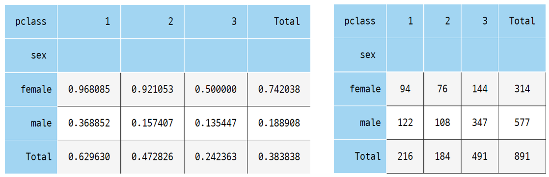 (์ด ๋ ๊ฐ ์ฑ๋ณ & ๊ทธ๋ฆฌ๊ณ ๊ฐ class ๋ณ ์์กด ์ฌ๋ถ ํ๊ท ๊น์ง๋ ์๋ก์ด column ๋ฐ row๋ฅผ ์ด์ฉํด์ ์์ฑํ๋ค)