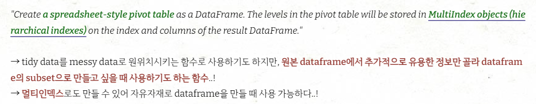 ๐ tidy data ํฌ์คํ ์์ ์ฐ๋ฆฌ๋ tidyํ data๋ฅผ ๋ง๋ค๊ธฐ ์ํด ๊ธฐ์กด dataframe์ meltํ๋ค๊ณ ํ์๊ณ , ๋ค์ ์์์น ์ํค๊ธฐ ์ํด pivot_table()์ ํ์ฉํ๋ค๊ณ ๋ฐฐ์ ๋ค.
